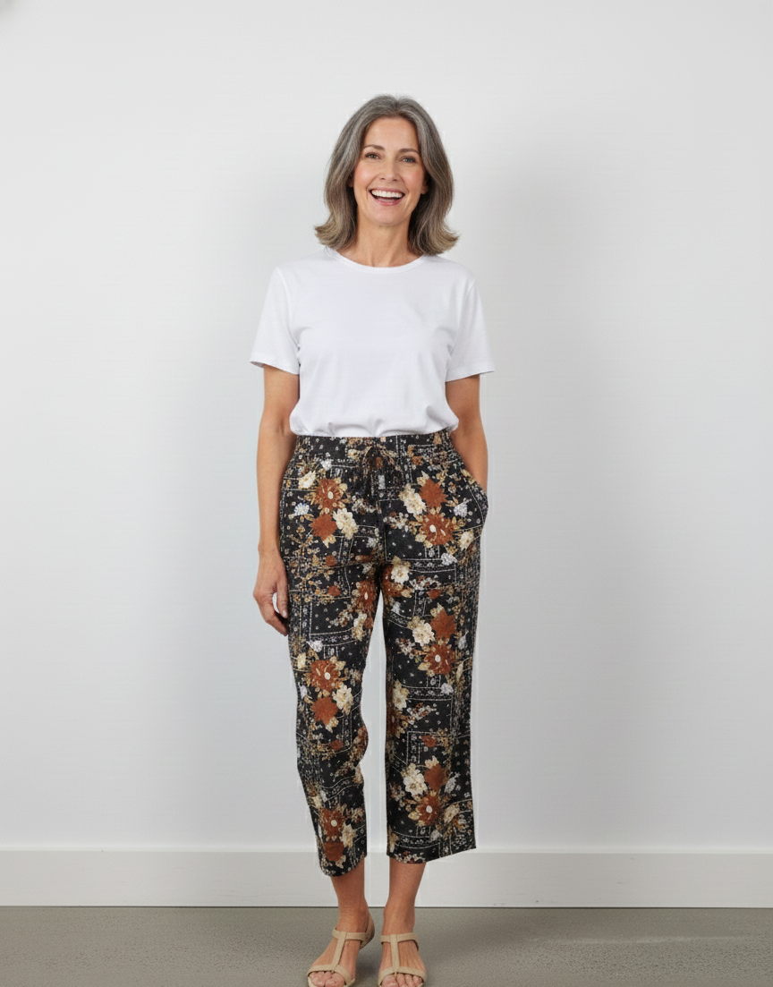 Easy, lightweight printed pants featuring a black base with warm floral tones. Finished with an elastic waistband and drawstring for a comfy fit, plus handy side pockets.