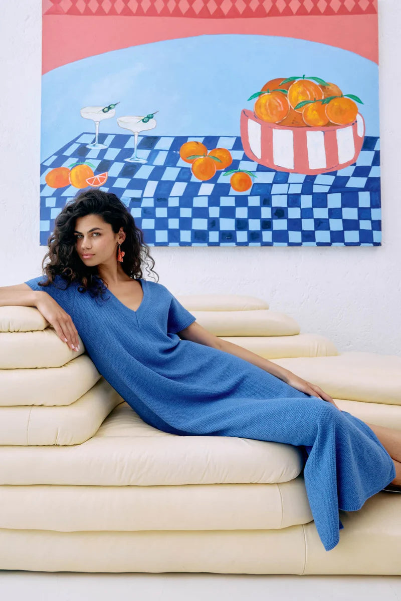 A fitted waffle knit dress for versatile style. Features V neckline, short sleeves and side splits at hem. Crafted from 100% cotton. Perfect for your next vacation, this dress pairs well with a cocktail in hand.