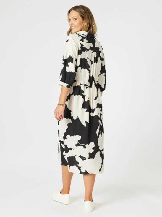 - The Barcelona Floral Dress features elegant double button accents, relaxed and flowing three-quarter sleeves, and a soft collar