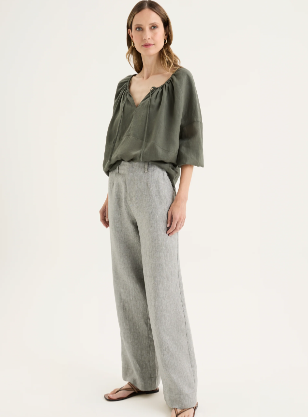 The Bohdi Top brings effortless boho charm with a touch of Yarra Trail polish. Made from a soft ramie-tencel blend, it has a light, linen-like feel and flows beautifully with movement. The neckline can be worn two ways - open for a relaxed V-shape or drawn in with the adjustable tie for a softly gathered look.