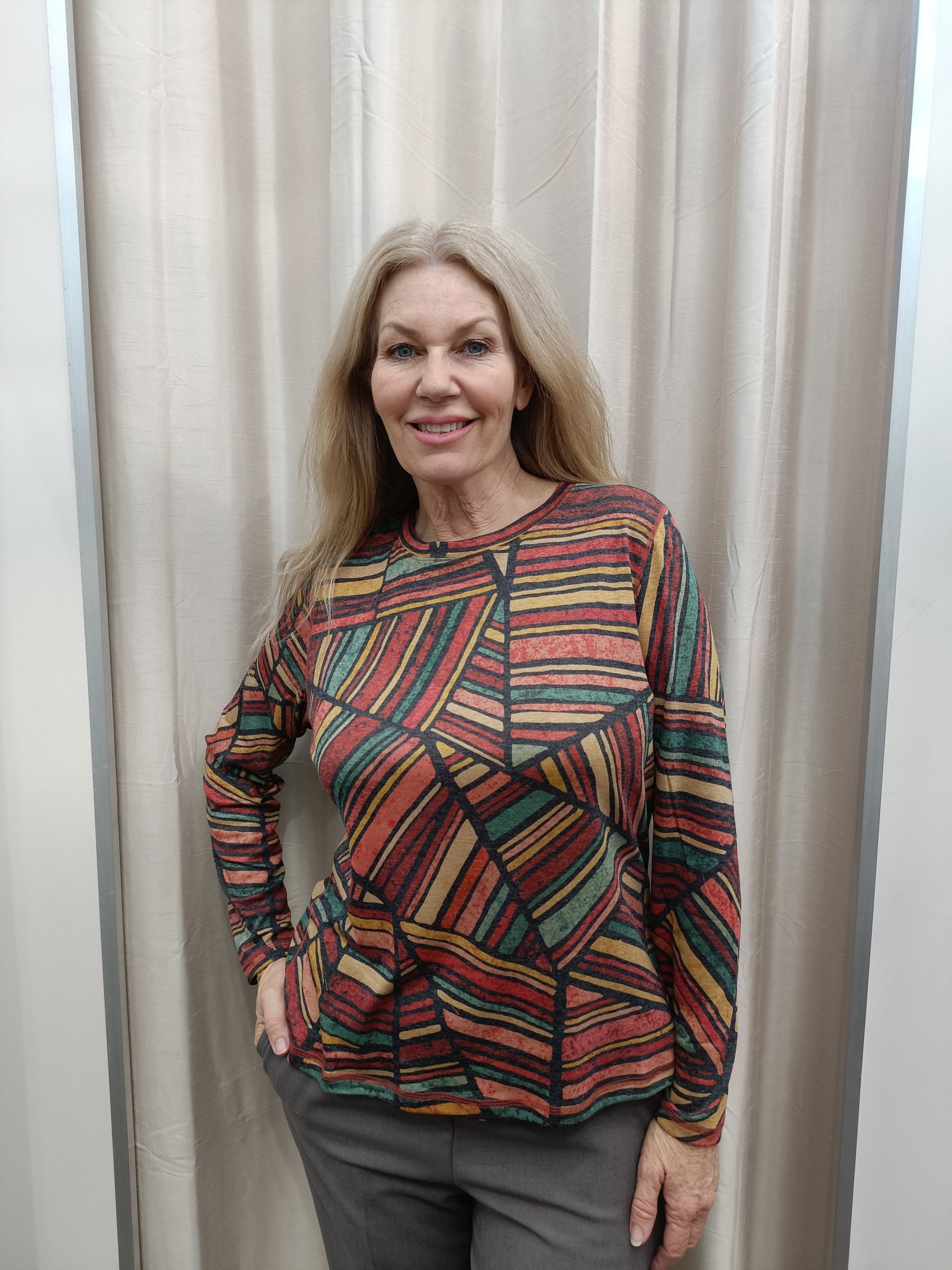 Make a statement with this eye-catching geometric print top, featuring a rich blend of autumnal hues and a striking abstract stripe pattern. The soft, lightweight fabric makes it perfect for layering or wearing solo, while the flattering relaxed fit ensures all-day comfort.