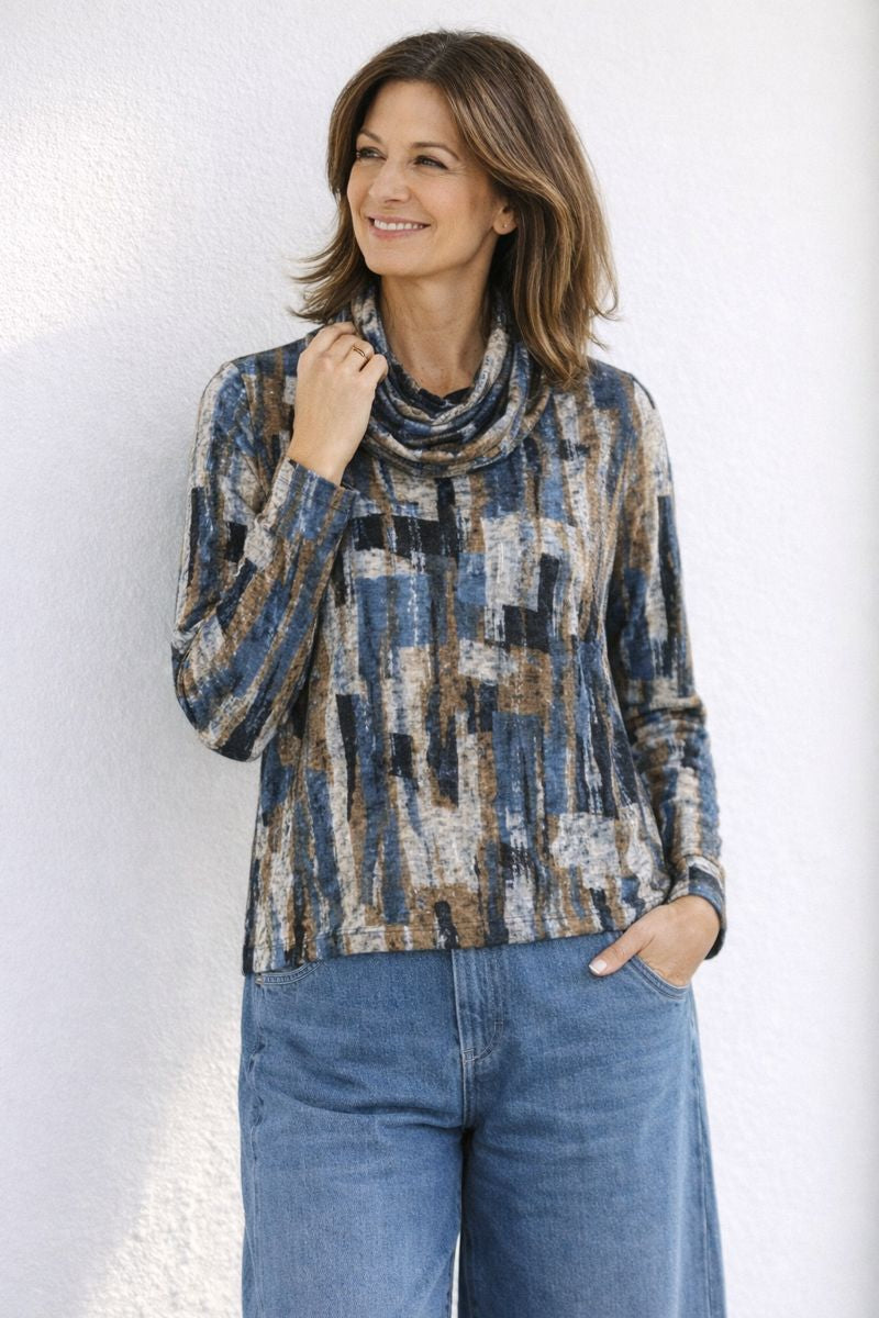 Artistic Print: Features a striking abstract pattern with a sophisticated blend of blue, tan, and charcoal tones that effortlessly elevates any neutral outfit.