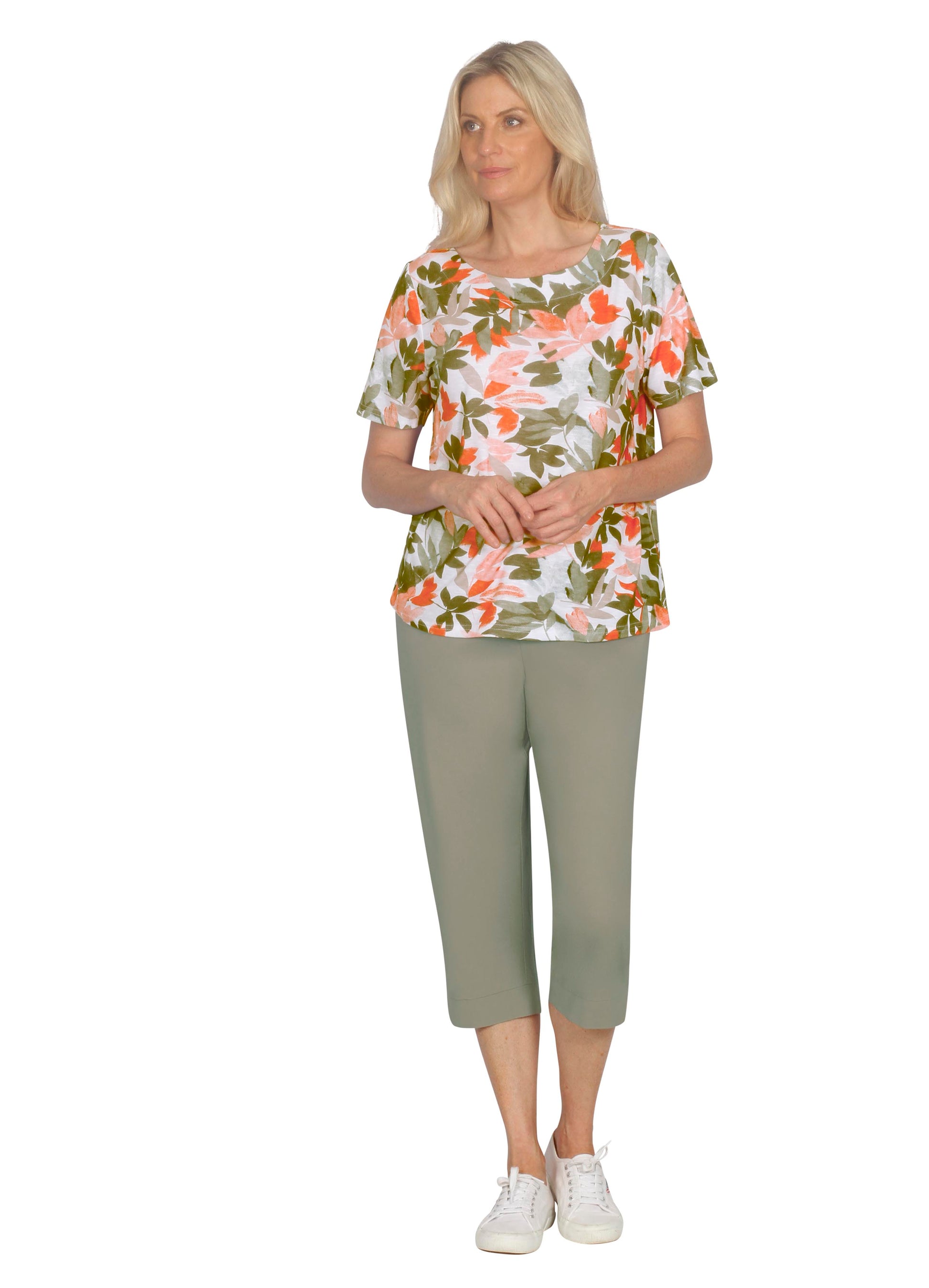 Bring a touch of nature to your wardrobe with this vibrant floral print top. Made from a soft and breathable blend of 95% polyester and 5% elastane, it offers a comfortable fit with a hint of stretch. The bold mix of coral, orange, and green foliage against a white background creates a fresh, eye-catching look. Featuring a classic round neckline and short sleeves, this easy-to-wear style is perfect for pairing with pants, capris, or skirts for a cheerful, everyday outfit.
