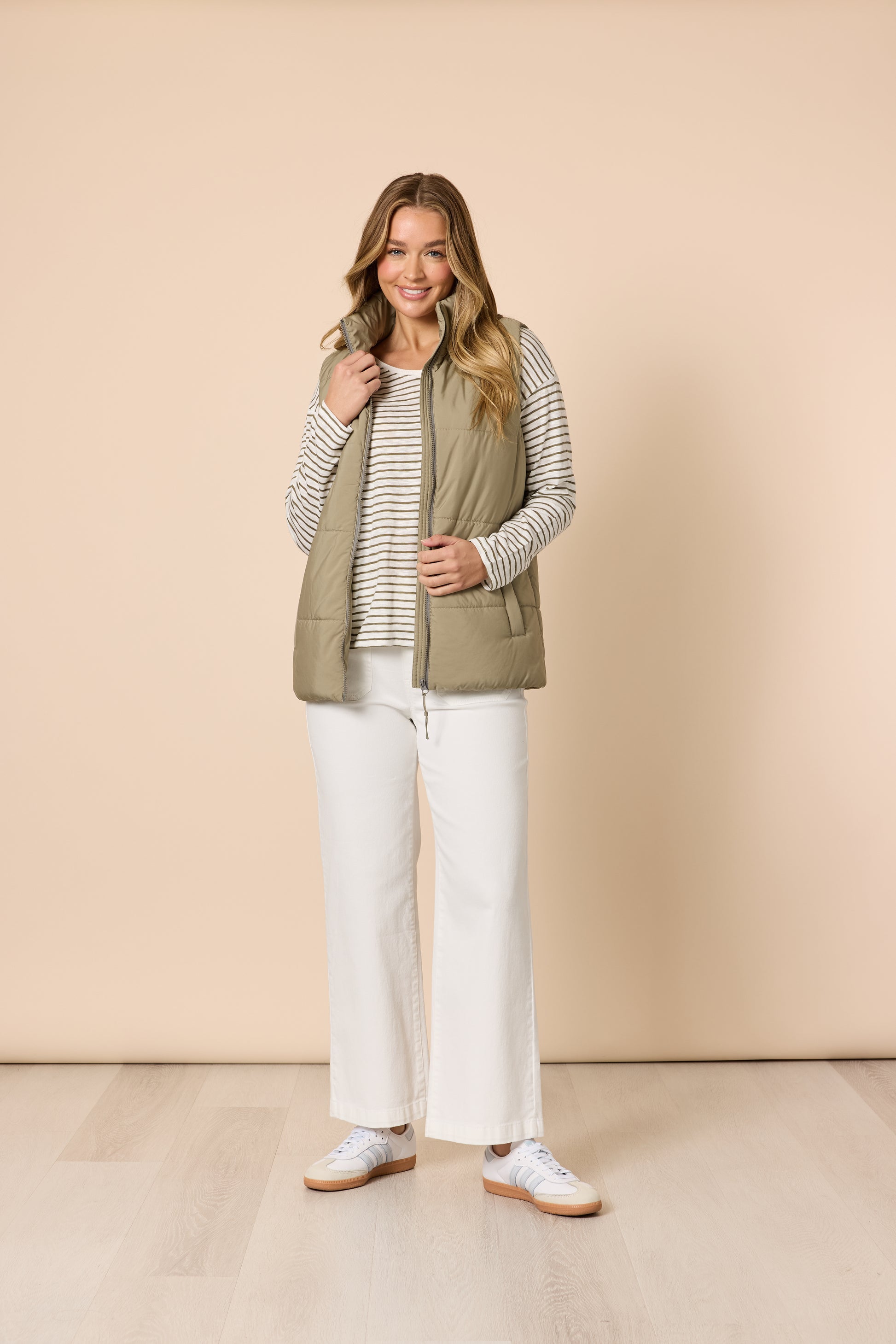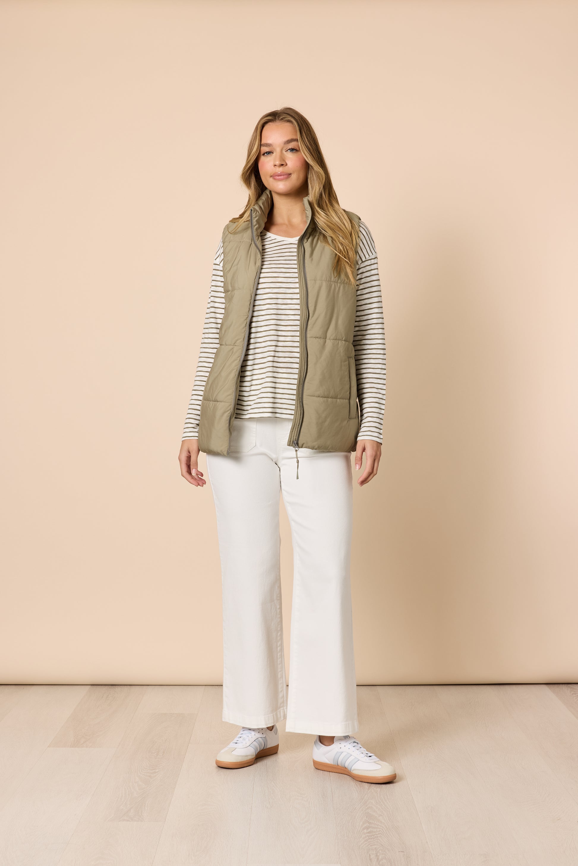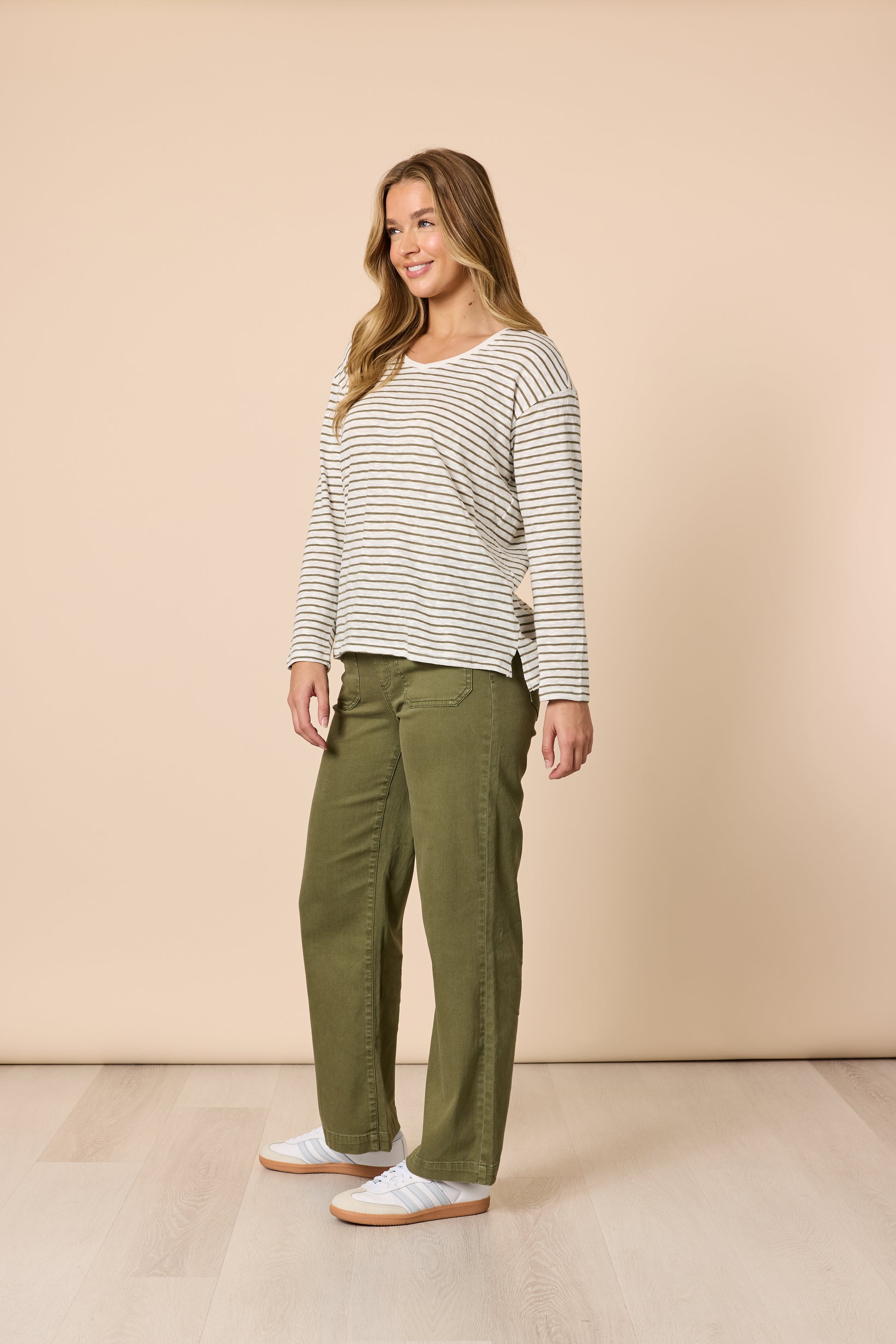 Elevate your everyday comfort without sacrificing style in these effortlessly chic pull-on utility jeans. Crafted from a premium cotton-elastane blend, these trousers offer the classic look of structured denim with the flexible, breathable stretch needed for all-day wear. The standout feature is the tonal ribbed knit waistband, providing a smooth, flattering fit that contours to your shape without the bulk of traditional hardware. Available in a soft, versatile Natural ivory and a deep, earthy Khaki, these wide-leg jeans feature practical front patch pockets and a relaxed silhouette that pairs perfectly with everything from casual knitwear to crisp blouses.