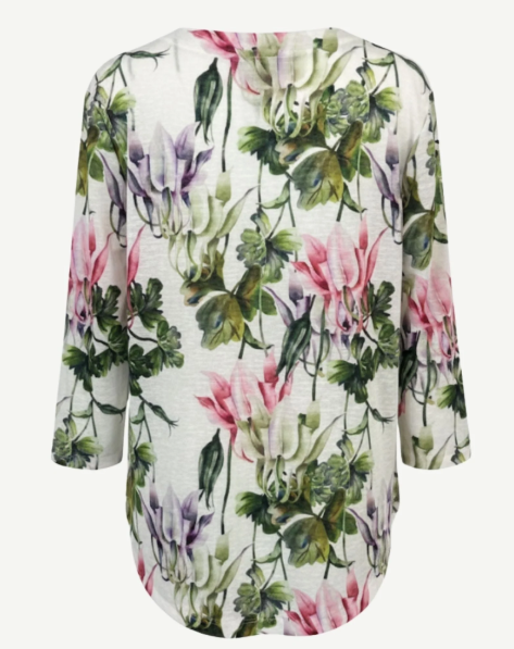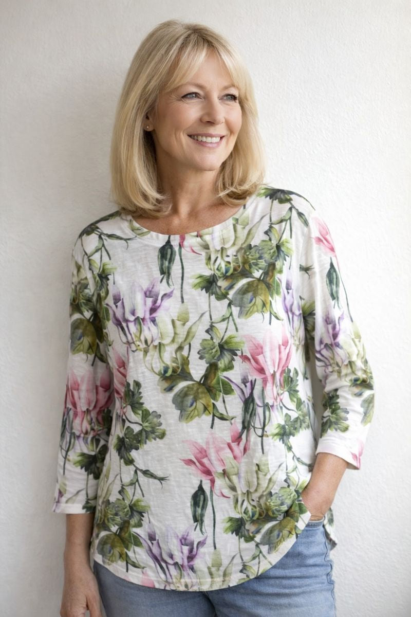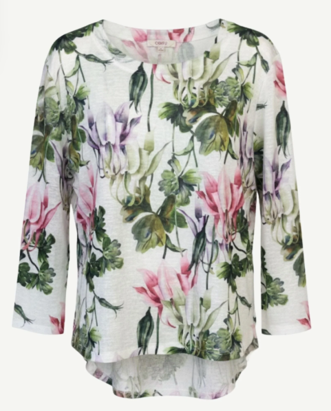 Elegant and fresh, the Cascade Top features cascading floral prints in soft shades of pink, lilac, and green set against a light background. Crafted from 100% polyester with a slub linen finish, it offers lightweight comfort and a naturally textured look. The relaxed silhouette with three-quarter sleeves makes it easy to wear while adding a refined touch. A graceful piece that brings colour and softness to everyday style.