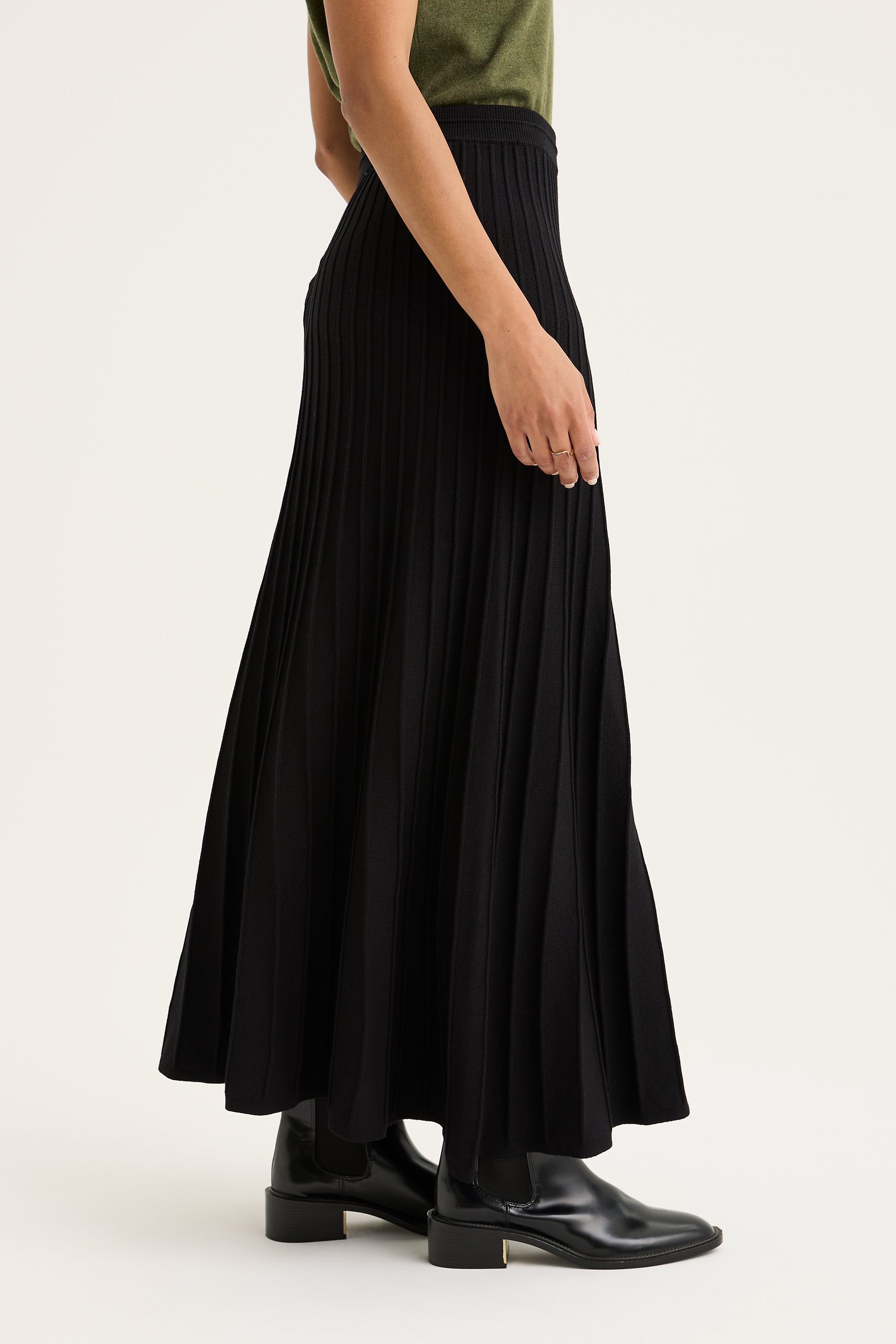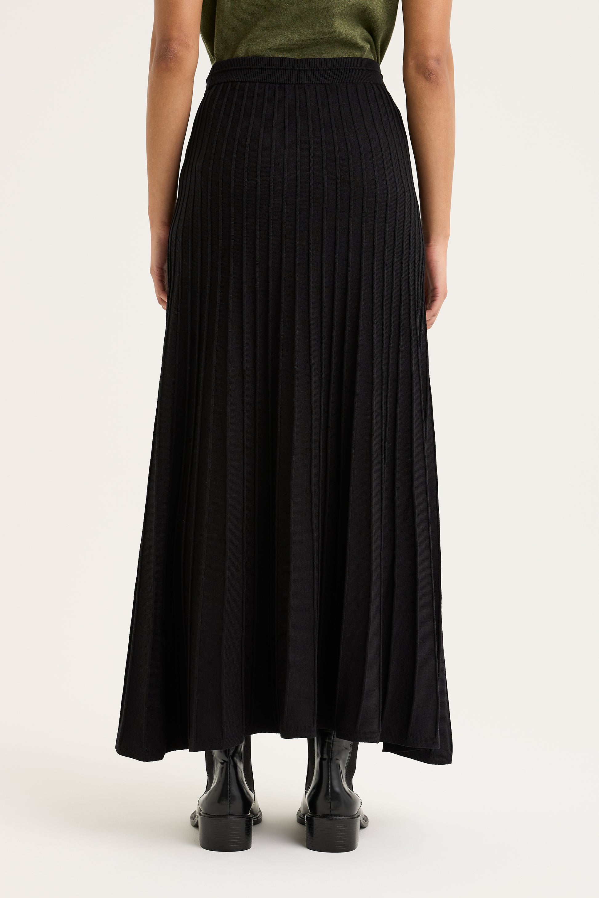 This elegant maxi skirt is crafted from a premium blend of 65% viscose and 35% nylon, offering a luxurious, silky drape with the perfect amount of stretch and recovery. Featuring a sophisticated pleated rib construction, the design creates a beautiful sense of movement and a flattering, elongated silhouette that flows effortlessly from the high-waisted band to the ankle. The elasticated waistband ensures all-day comfort without compromising on style, while the resilient nylon blend helps the skirt maintain its crisp, architectural pleats through every wear. A versatile foundation piece in timeless black, it transitions seamlessly from a professional office look with a tucked-in knit to an elevated evening ensemble when paired with boots.