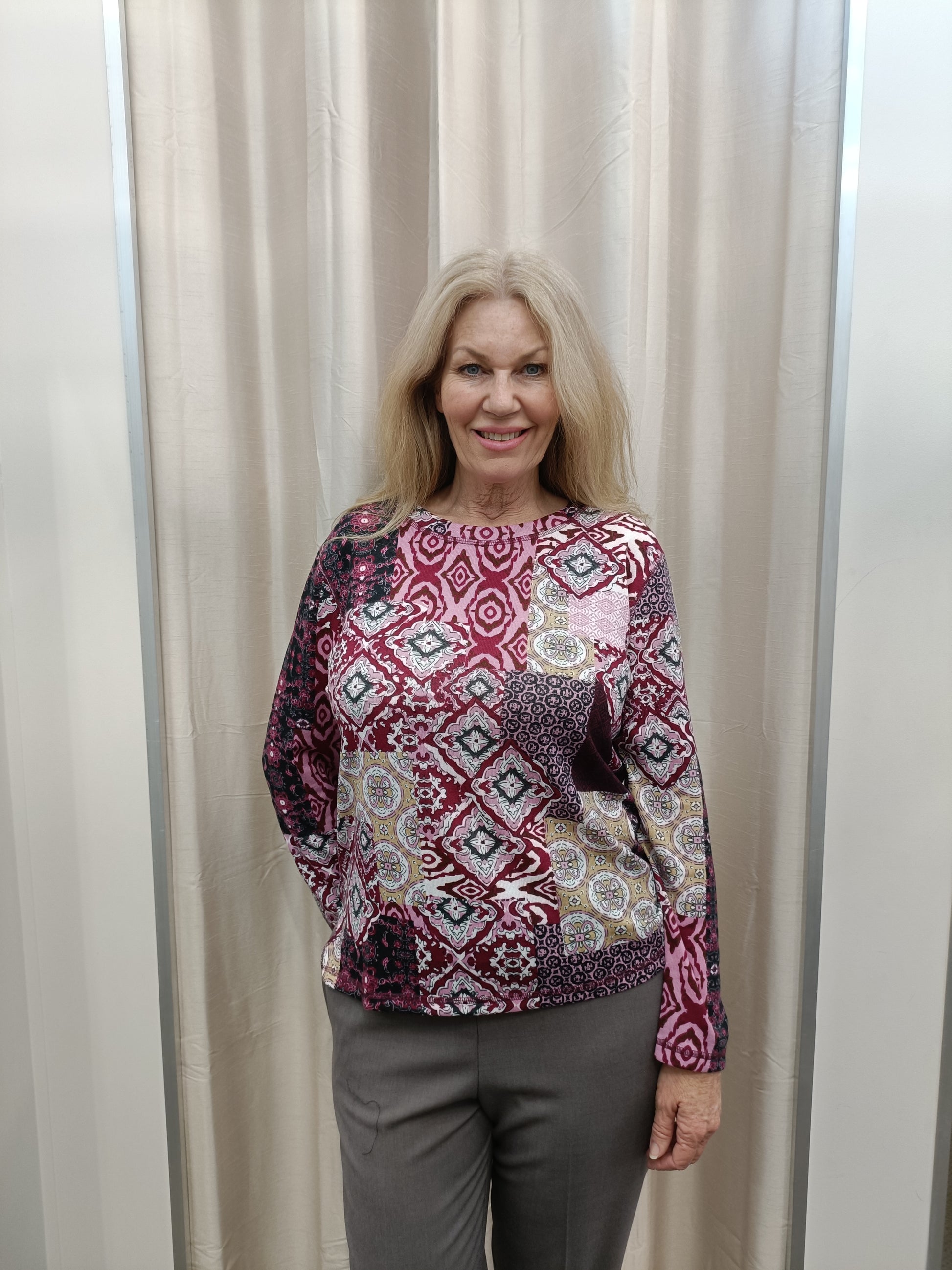Add a touch of artistic elegance to your wardrobe with this bohemian-inspired patchwork print top. Featuring a stunning mix of intricate patterns in rich burgundy, gold, and black hues, this top brings a warm, sophisticated feel to any outfit.