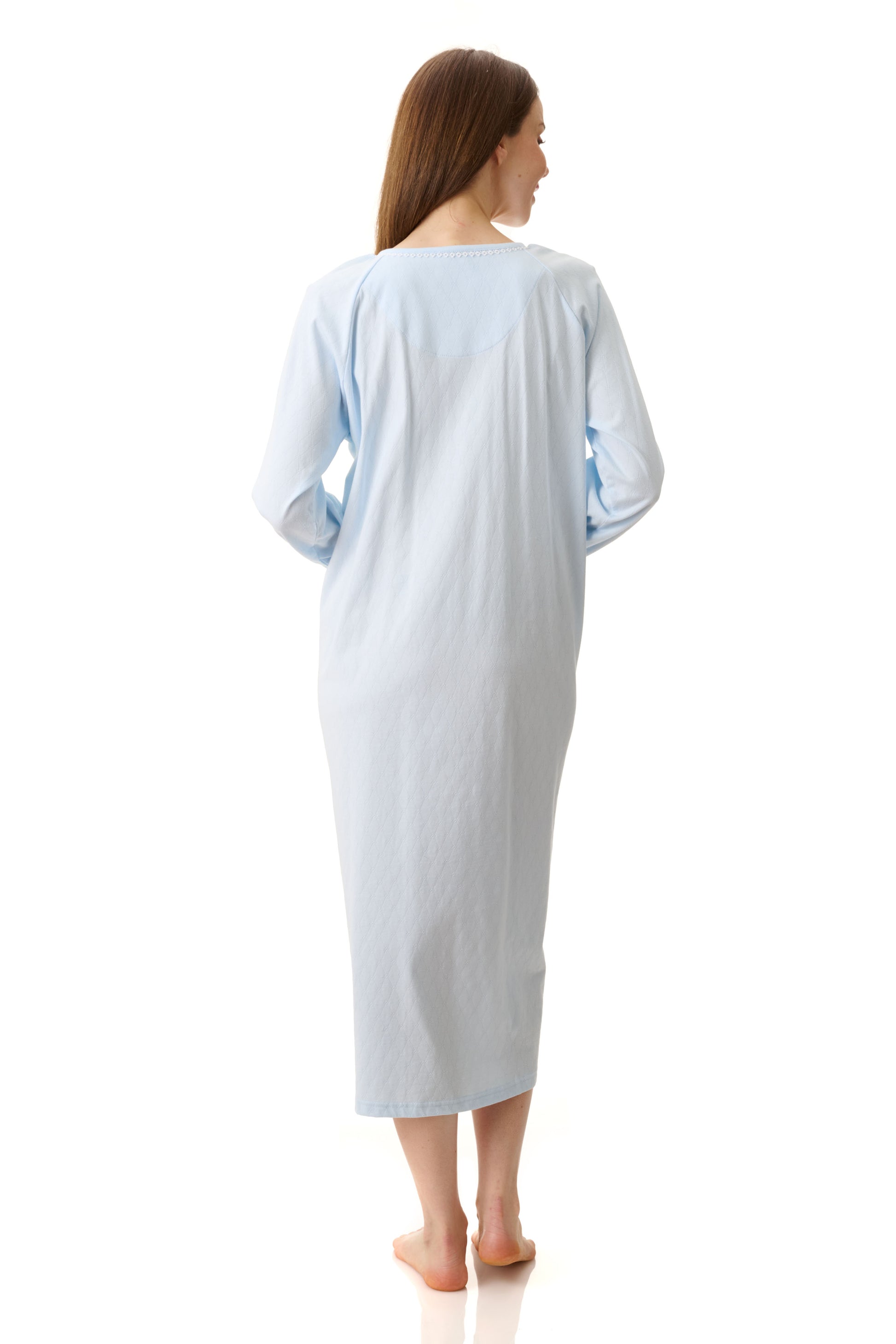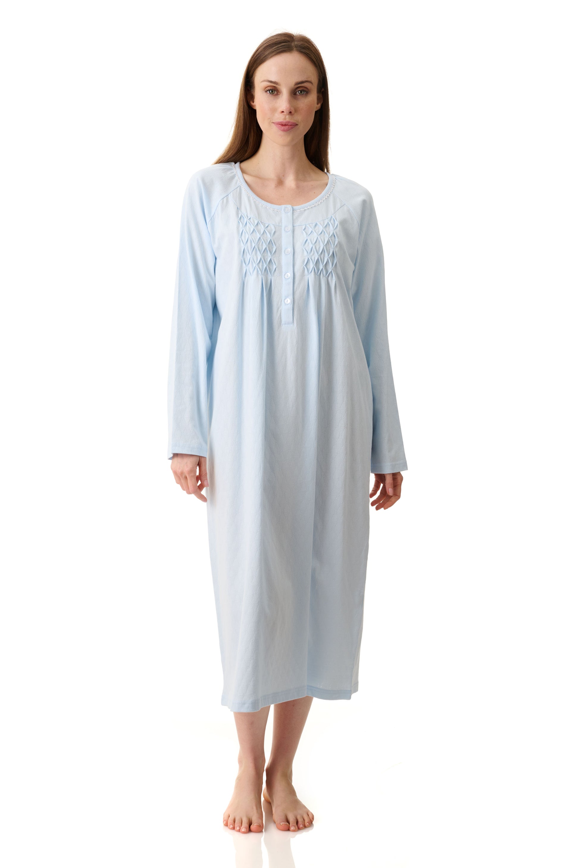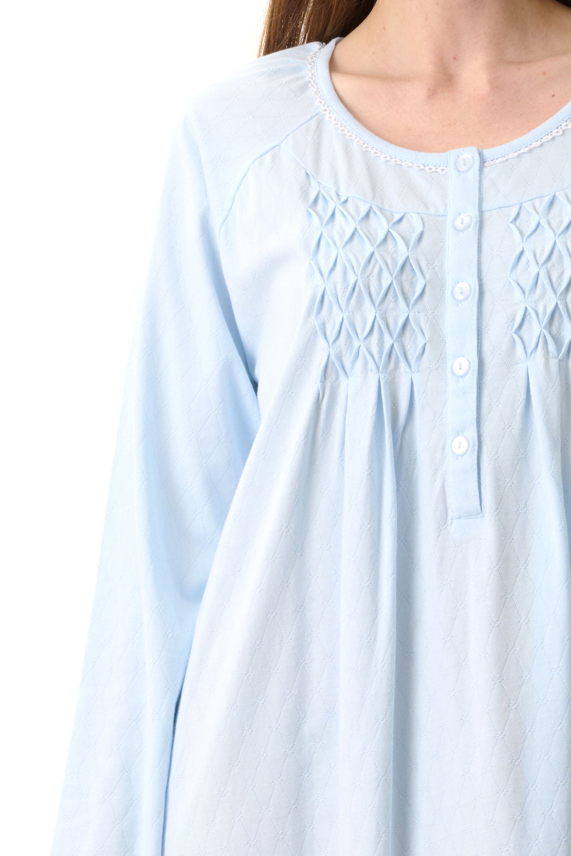 Drift into dreamland with this Classic Smocked Long Sleeve Nightie in a soothing pastel blue. Designed for ultimate comfort, this nightie features a beautifully smocked bodice with delicate embroidery detailing, adding a touch of elegance to your sleepwear. The soft, breathable fabric ensures a cozy feel throughout the night, while the button-front design allows for easy wear. With its long sleeves and relaxed fit, this timeless piece is perfect for cooler nights, offering both warmth and freedom of movement. A must-have for effortless bedtime luxury!