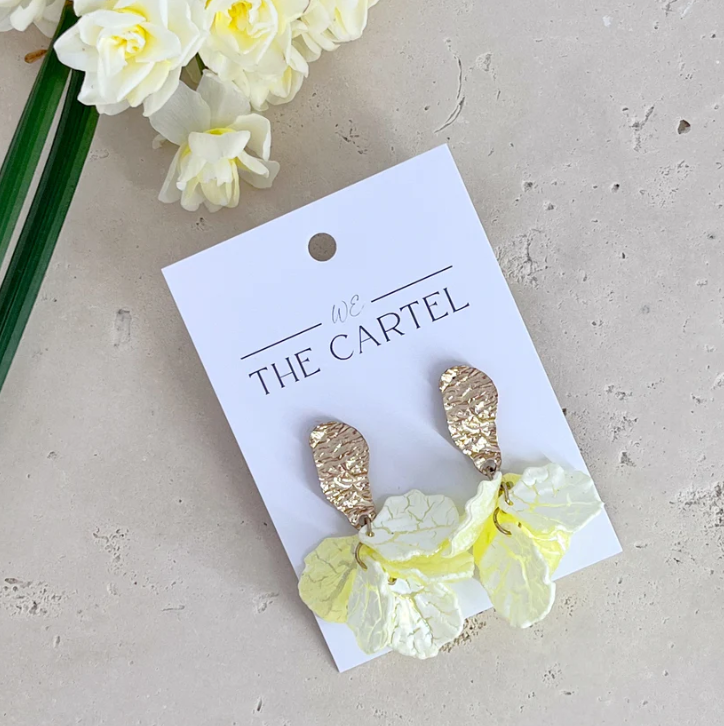 Gorgeous gold coloured distressed metal earrings with delicate pearlescent lemon petals that are perfect for any occasion.