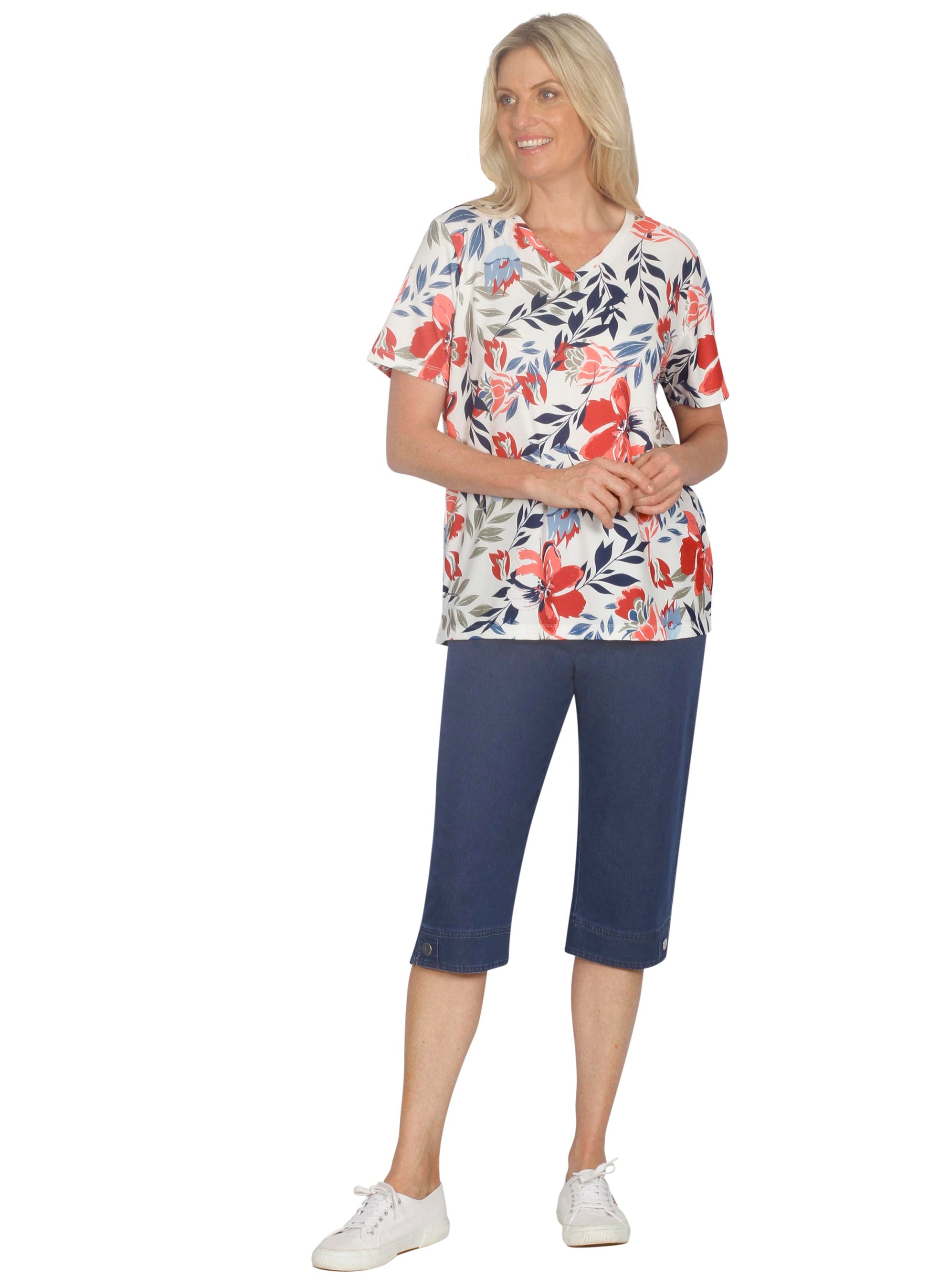 Bright and bold, this floral print top is perfect for adding a splash of colour to your everyday wardrobe. Made from a soft and stretchy 95% polyester and 5% elastane blend, it offers all-day comfort with a flattering fit. The vibrant red, navy, and soft blue floral design stands out beautifully against the light background, while the V-neckline and short sleeves create a relaxed, easy-to-wear style. Ideal for pairing with capris, jeans, or skirts, this top is a versatile choice for casual outings or weekend wear.