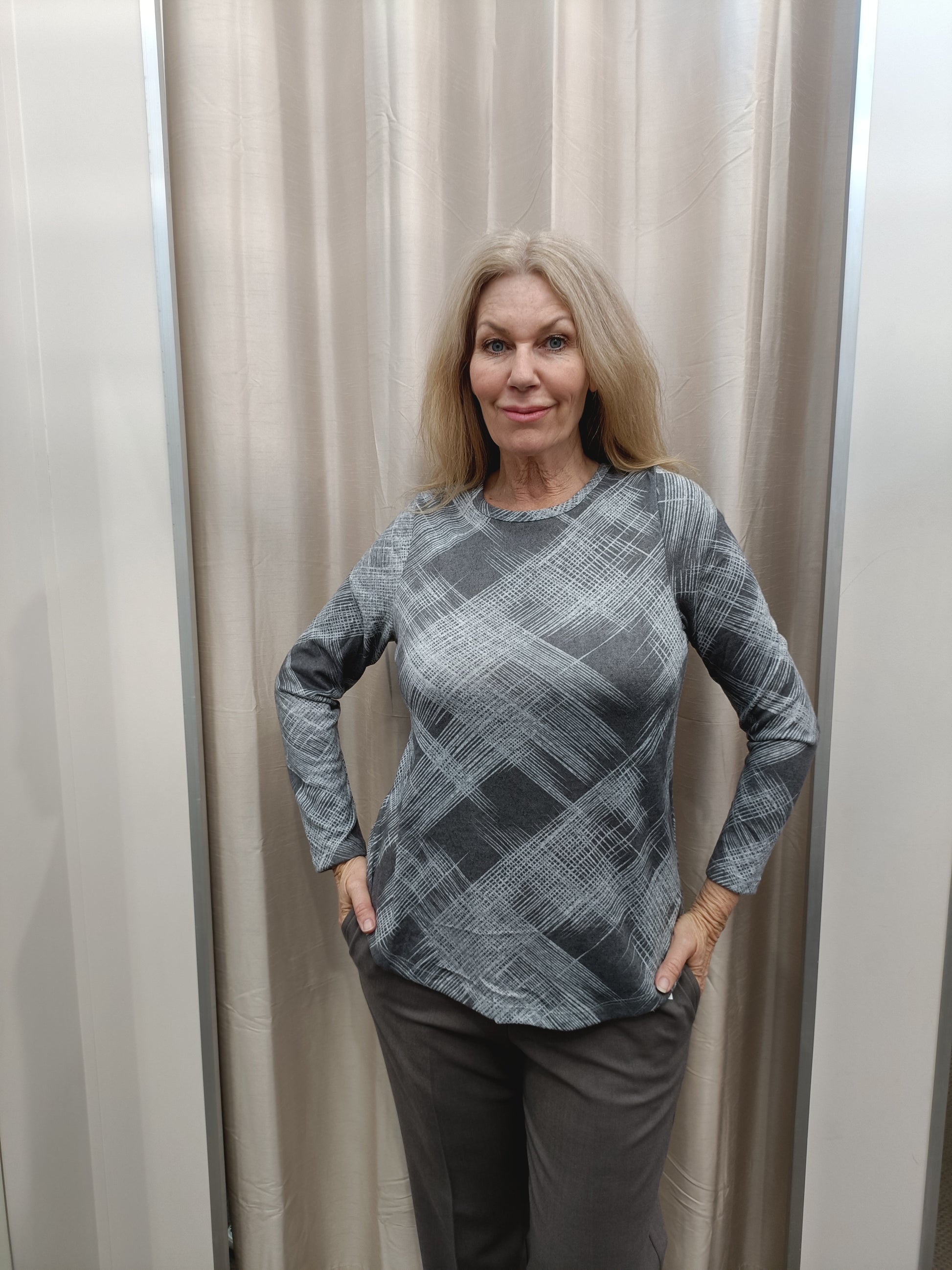 Upgrade your wardrobe with this sophisticated long-sleeve top, featuring a modern abstract print in striking monochrome tones. Designed for both comfort and elegance, this versatile piece is perfect for day-to-night styling.