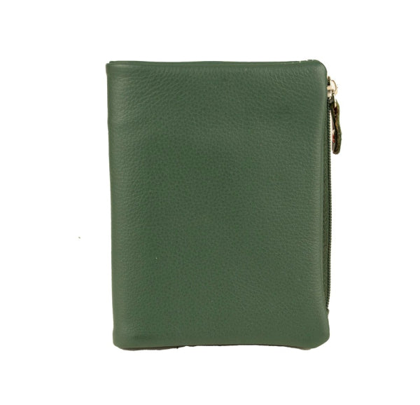 Small leather wallet with a magnetic closure that holds 6 credit cards, has a currency sleeve and zip pocket. Measures approximately 19 cm W x 12.5 cm H x 2 cm D