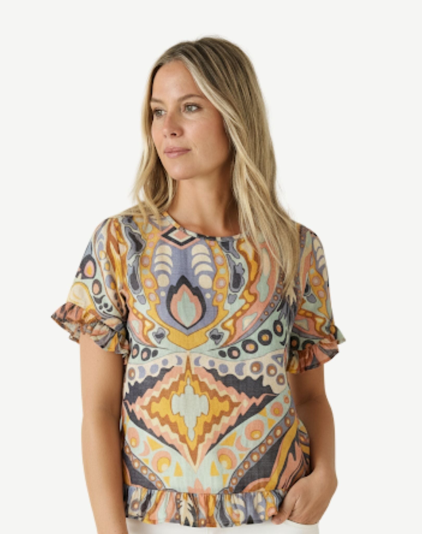 Bring colour and charm to your wardrobe with the Harmonious Hues top, featuring a bold geometric-inspired print in warm and cool tones. Crafted from a lightweight fabric, it offers both comfort and breathability, perfect for all-day wear. The round neckline and short sleeves with soft frill details add a feminine touch, while the frilled hemline gives the piece playful movement. Pair it with white pants or denim for an effortlessly stylish look that works from day to evening.