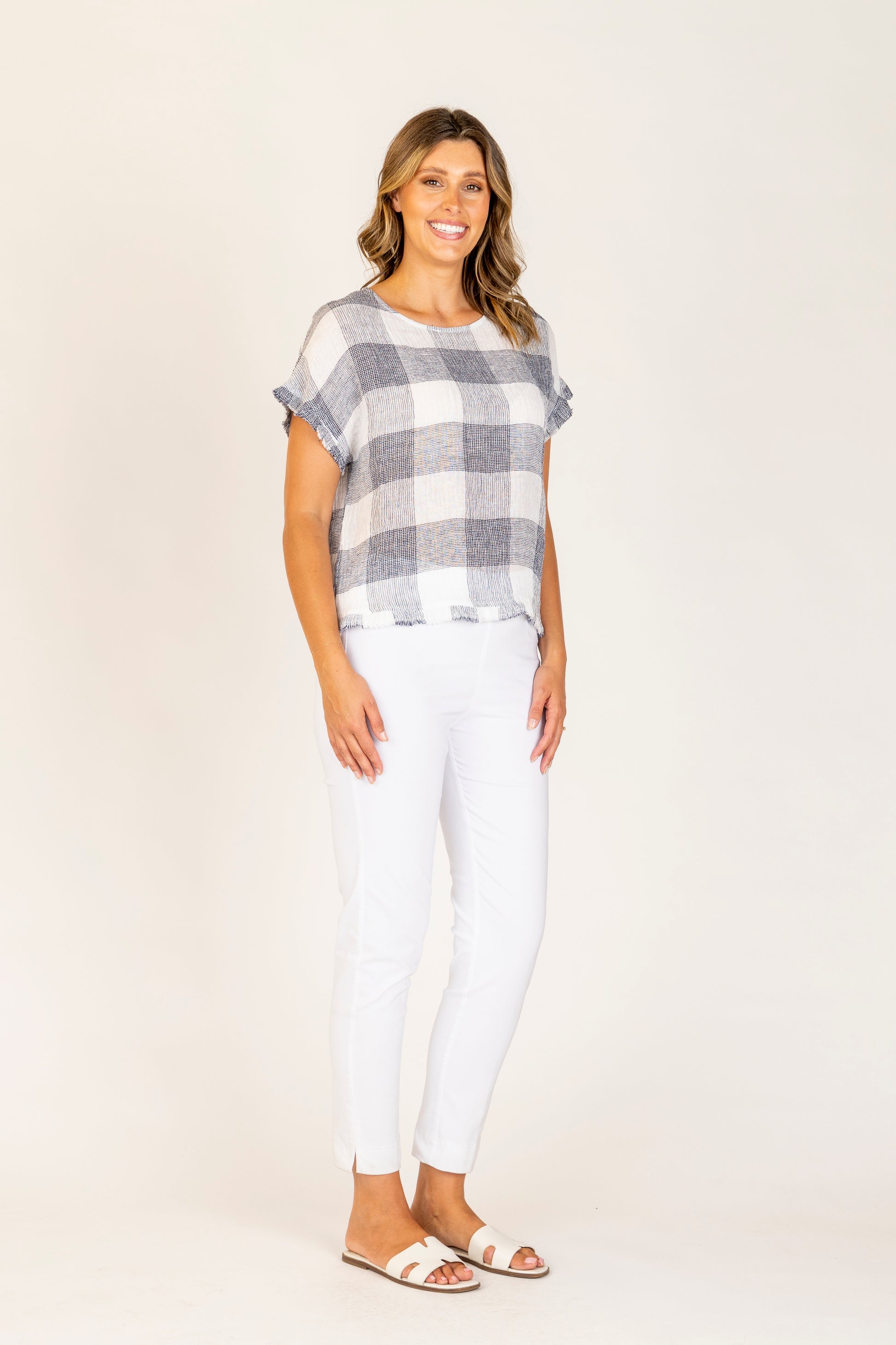 Breezy and effortlessly stylish, this check linen top is the perfect choice for warm-weather dressing. Crafted from lightweight linen, it offers natural breathability and a relaxed fit for all-day comfort. The navy and white check pattern adds a timeless touch, while the short sleeves feature a soft frayed edge for casual charm. Finished with a straight hemline, this versatile piece pairs beautifully with jeans, pants, or skirts for an easy, polished look.