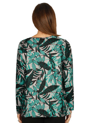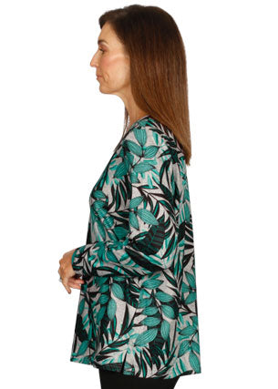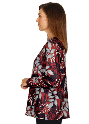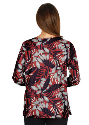 Make a statement with this sophisticated printed top, featuring a rich leaf-inspired print in shades of deep red, hunter green, navy, black and grey. Designed for both comfort and elegance, this versatile top is the perfect addition to your wardrobe, whether you're dressing up for an occasion or keeping it casual.