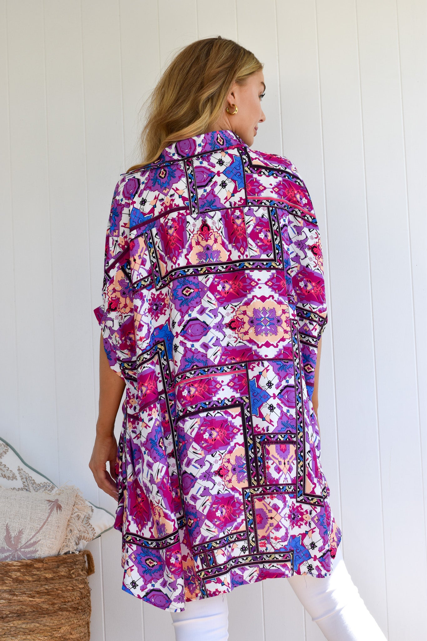 Make a bold style statement with the Lola Shirt by Sanctum. A vibrant, easy-fit piece designed for effortless comfort and colour. Crafted from 100% rayon, this shirt drapes beautifully on the body and feels soft and breathable against the skin. The striking geometric print in pink, purple, and blue tones brings a lively touch to any outfit, perfect for brightening up your everyday look.