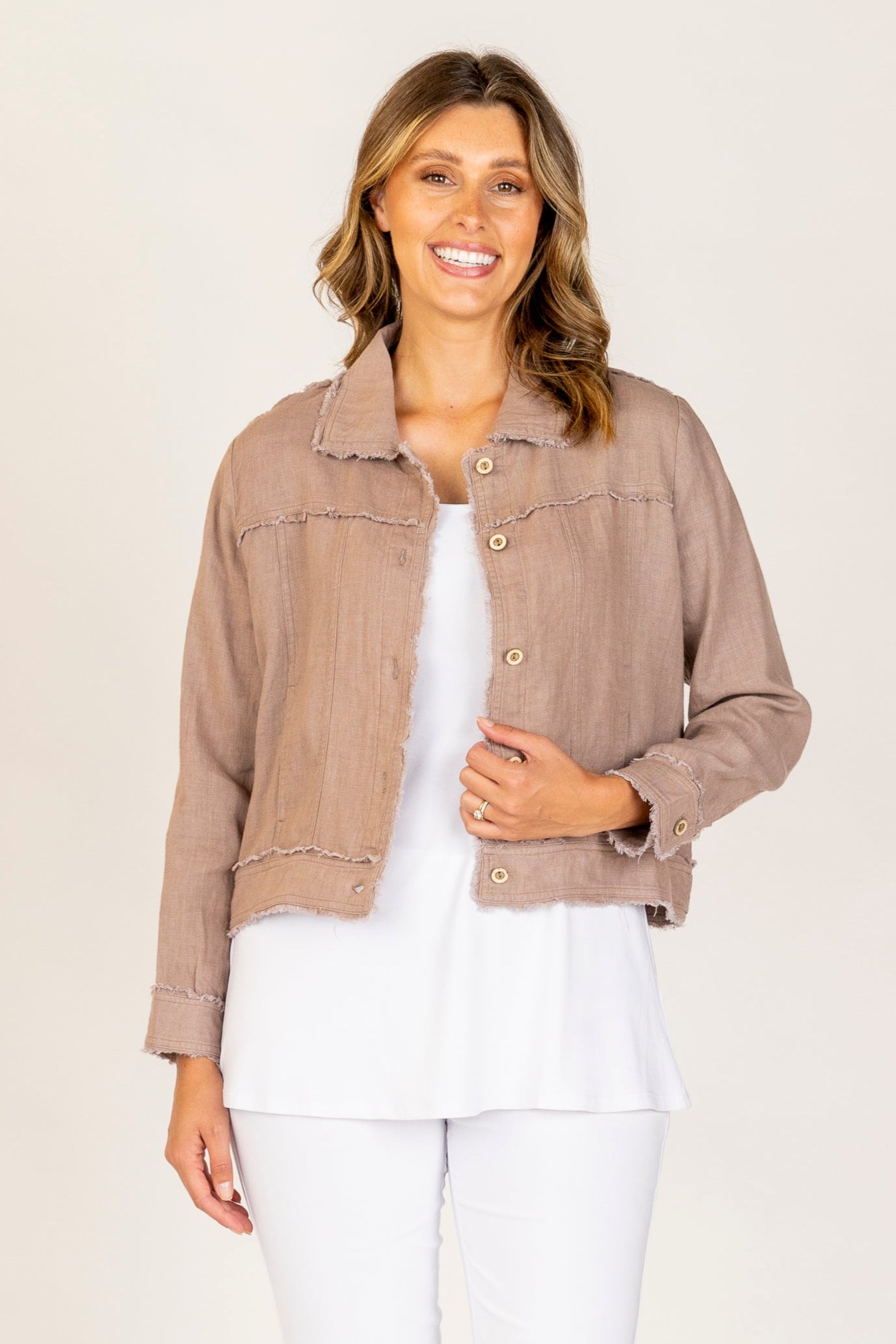 Add effortless style to your wardrobe with this versatile 100% linen jacket. Soft, breathable, and lightweight, it’s perfect for layering and easy everyday wear. Designed with full-length sleeves, a relaxed fit, and raw-edge detailing along the seams and buttons, it offers a modern twist on a classic look. Wear it open for a casual feel or buttoned up for a more polished finish — ideal for year-round styling.