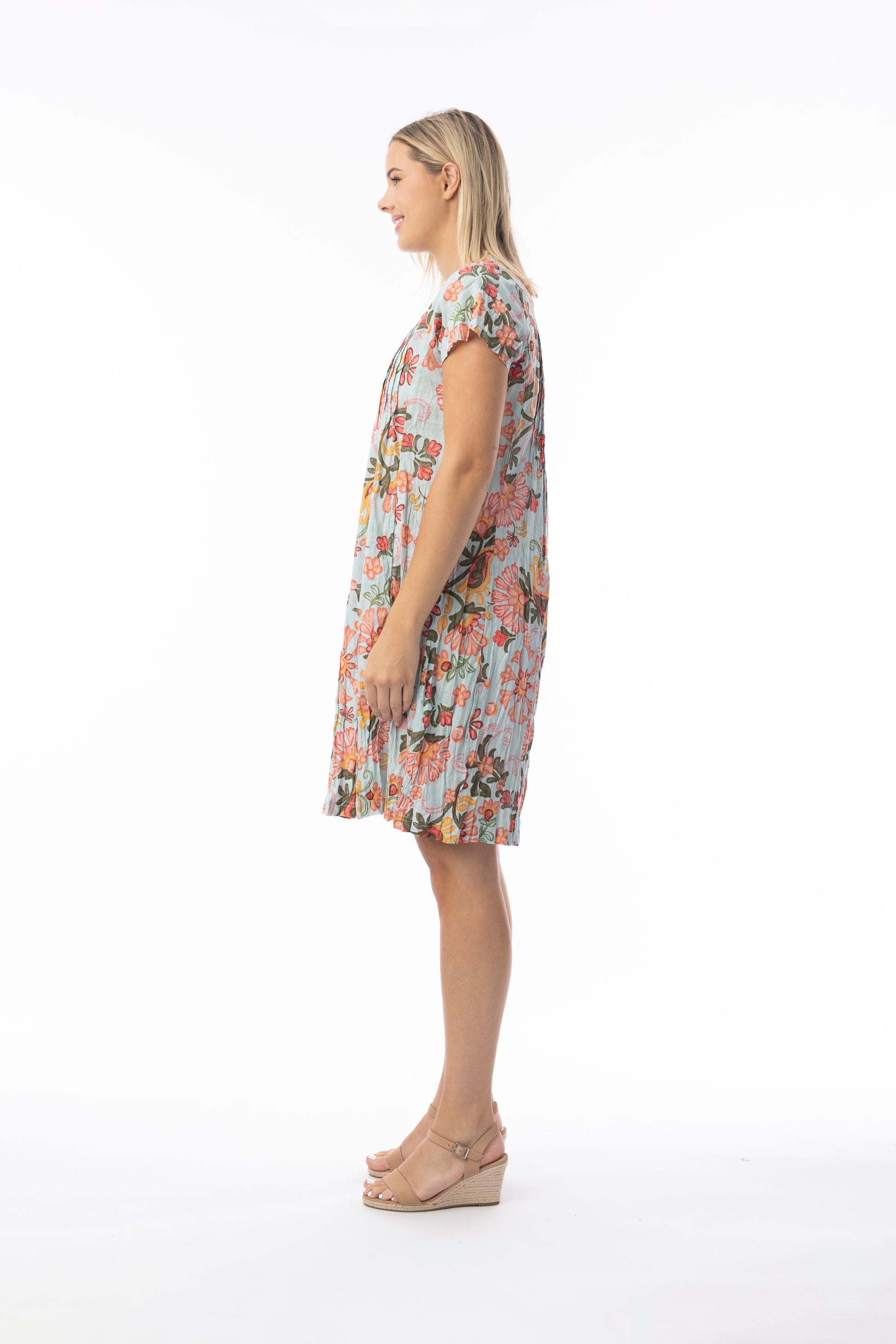 Designed with a flattering V-neckline, short sleeves, and delicate pin-tuck pleat detailing through the bodice, it offers both structure and flow. The relaxed fit and gently gathered skirt provide ease of movement, making it ideal for warm days, holidays, and casual outings.