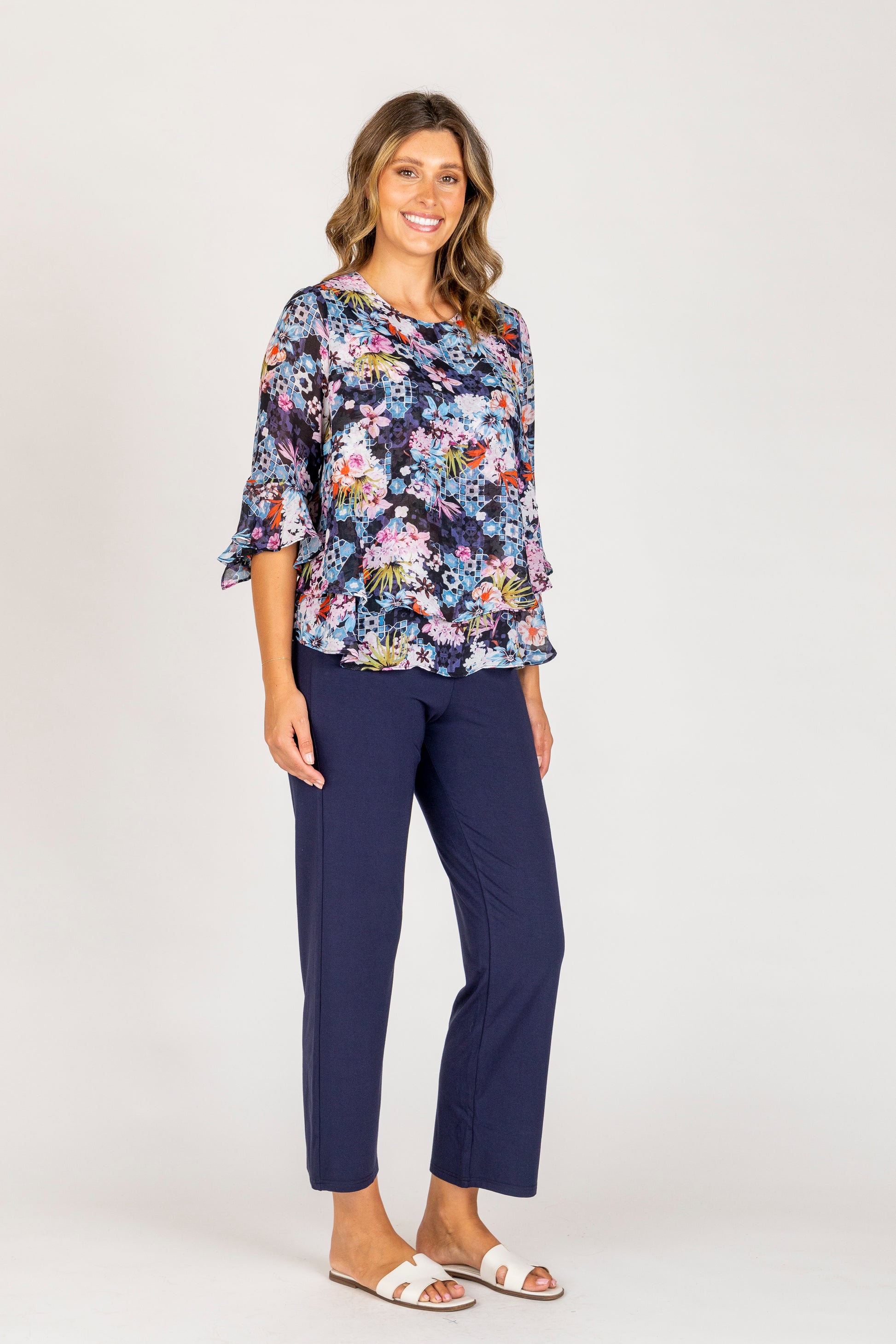 The layered design creates a flattering, floaty silhouette, while the round neckline and 3/4 sleeves with delicate ruffle cuffs add feminine charm. Perfect for both daytime outings and evening occasions, this top pairs beautifully with slim pants or skirts for a polished finish.
