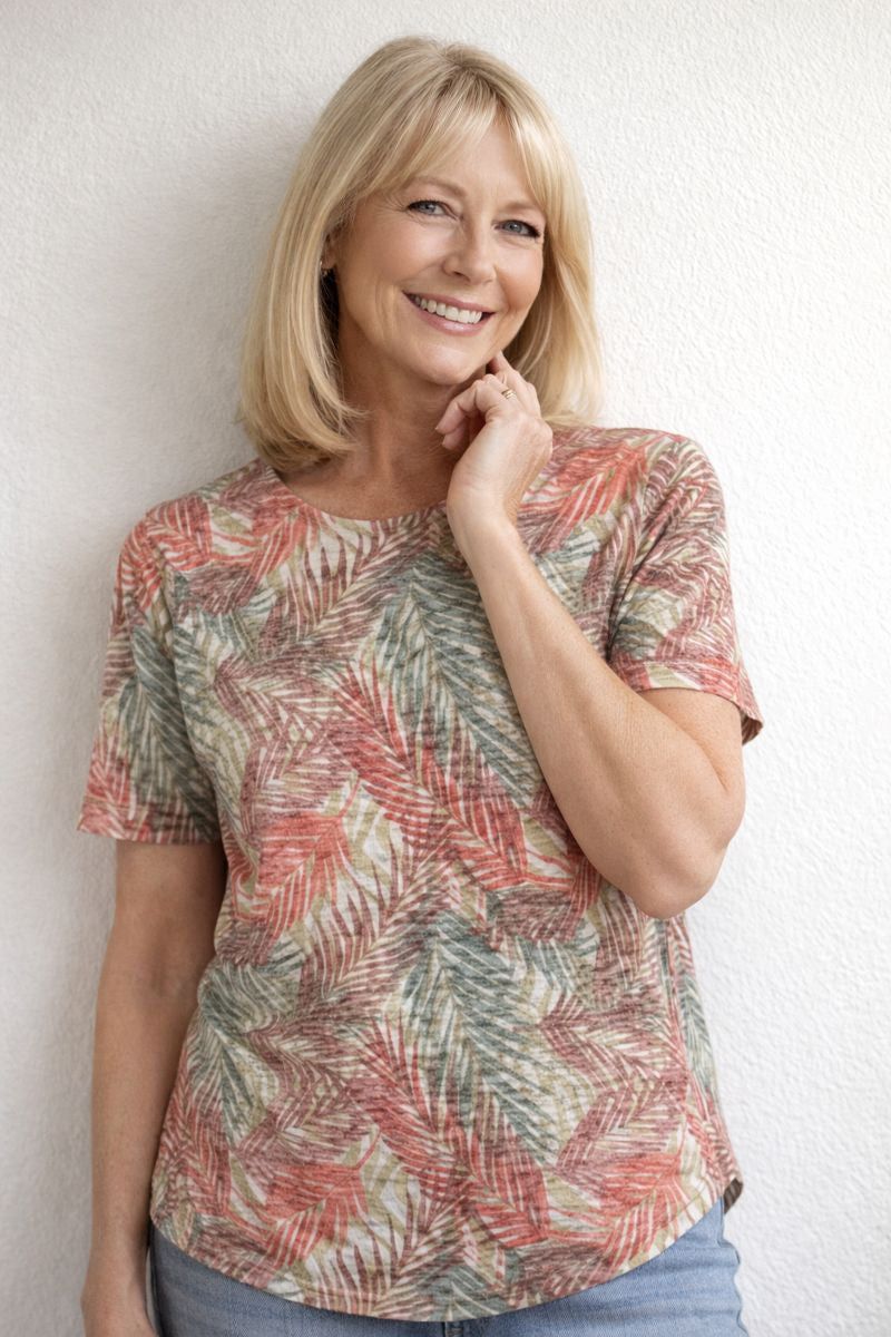 The Meadow Top is alive with vibrant leaf-inspired prints in warm reds, greens, and golden tones. Made from a cotton-rich burnout jersey, it combines breathable comfort with a textured, lightweight finish. The relaxed silhouette and softly flared short sleeves create an easy, feminine look. A lively piece that brings natural colour and charm to everyday dressing.