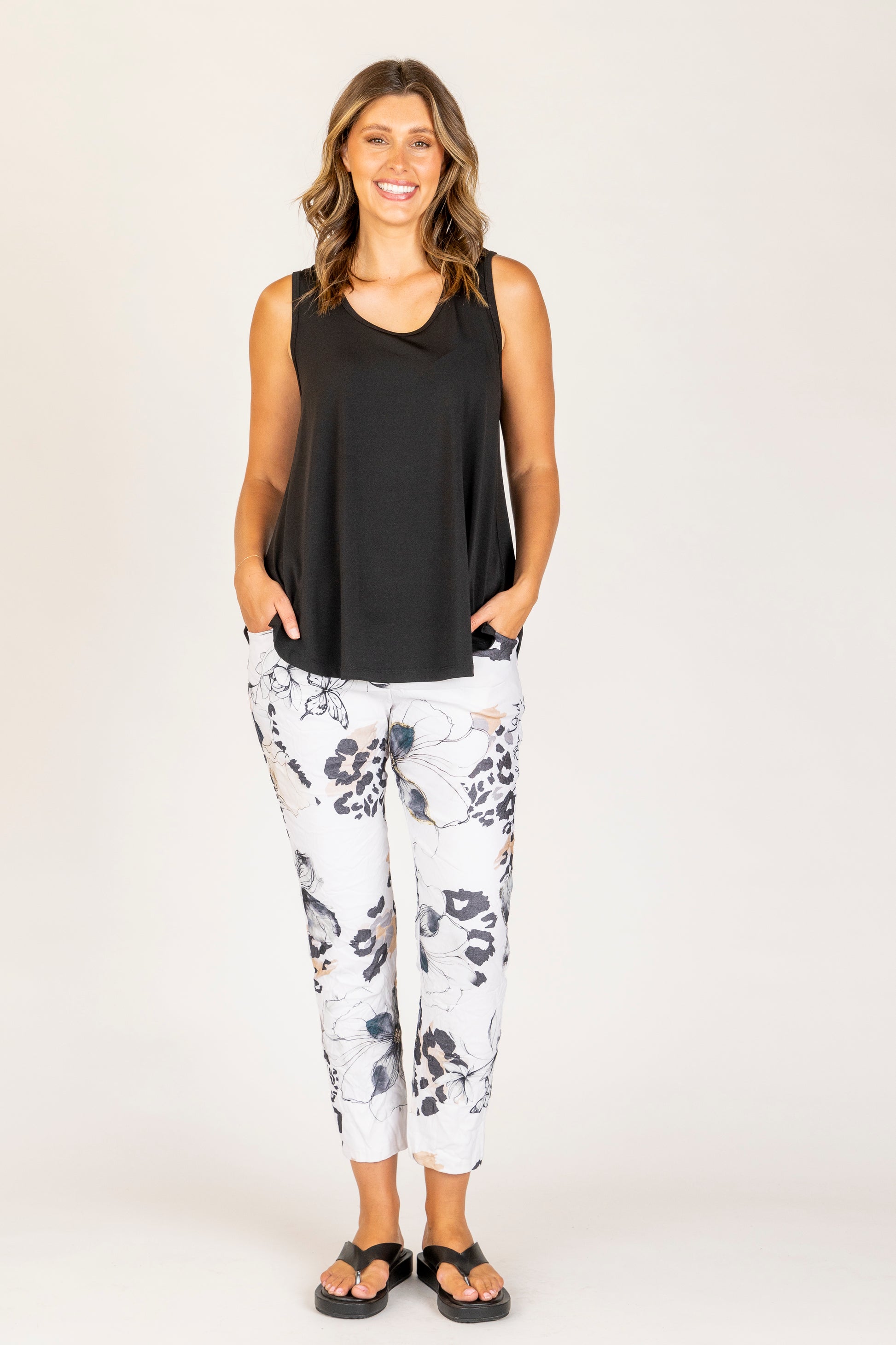 The sleeveless design makes it perfect for warm weather, while the slight flare at the hem adds movement and flow. A versatile wardrobe essential, it pairs effortlessly with printed pants, skirts, or shorts for both casual and polished outfits.
