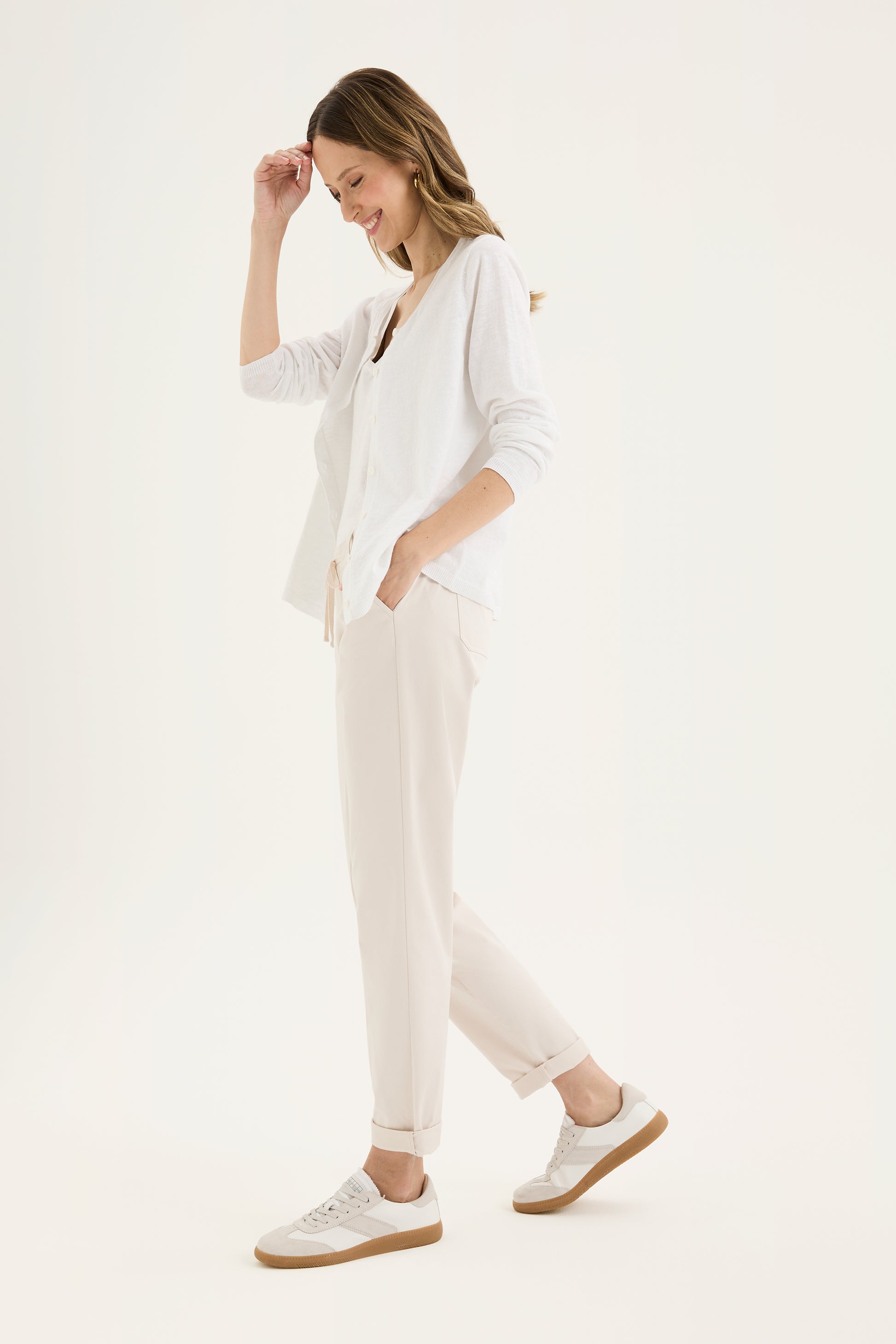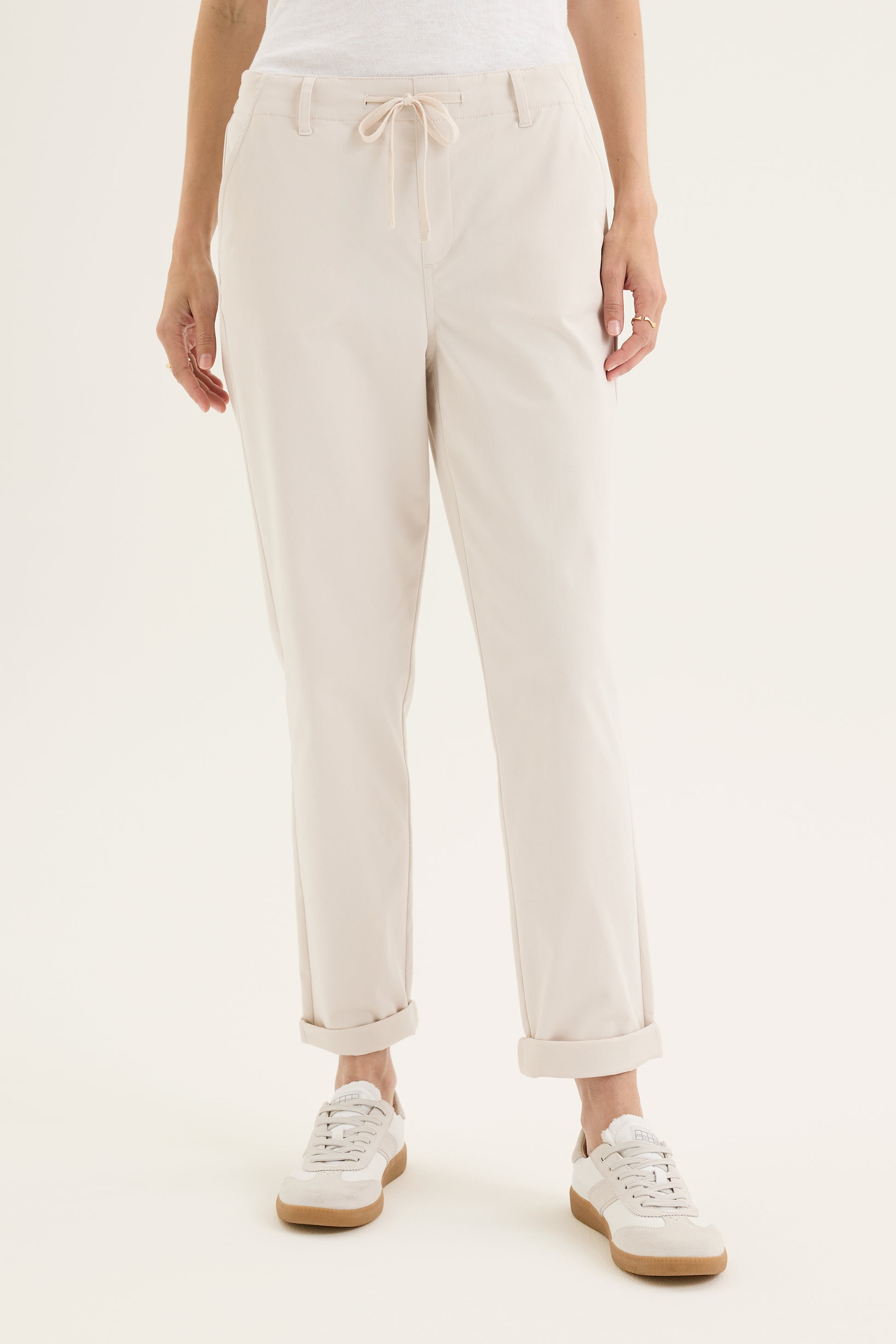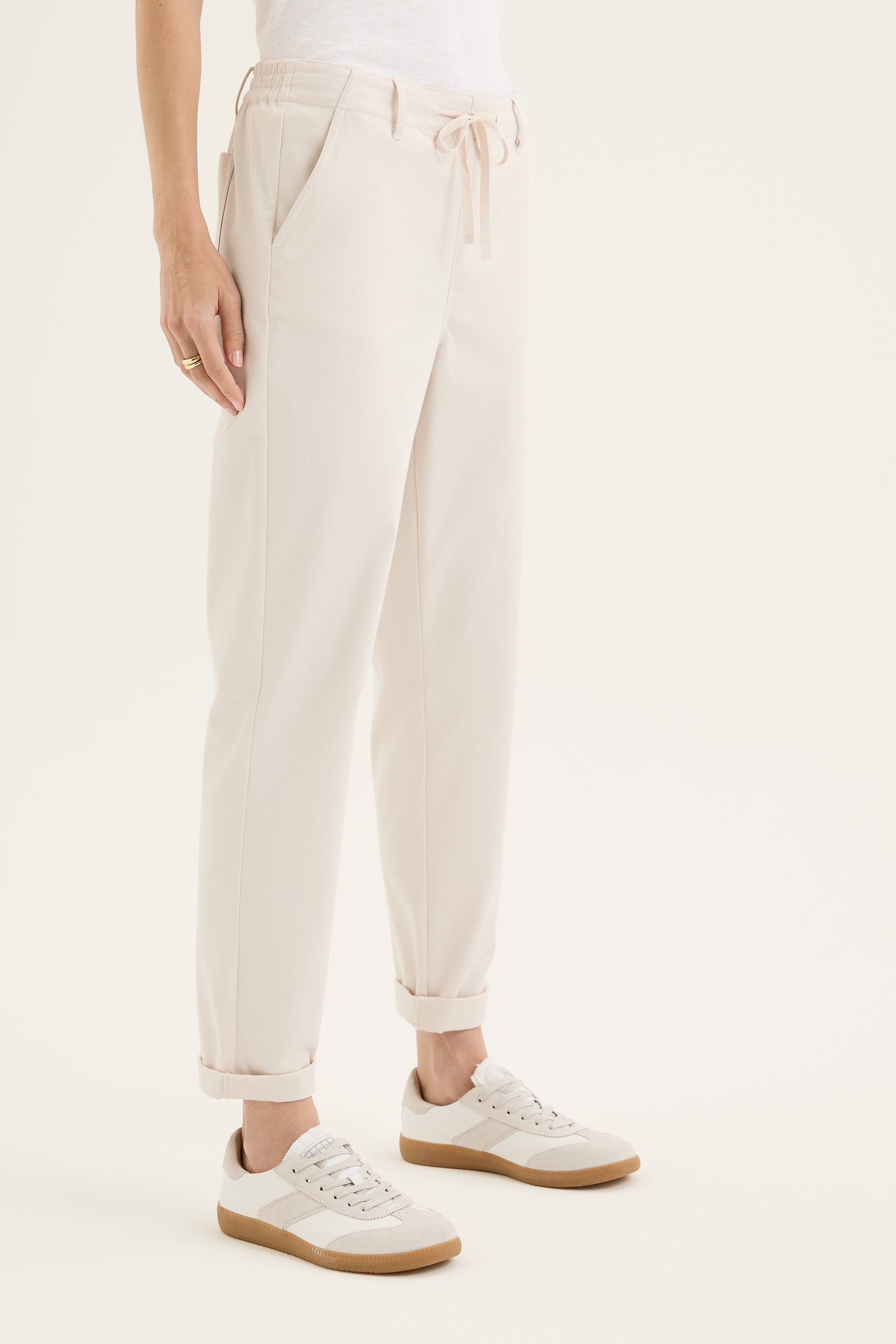 The elasticated back waistband and flat front are finished with belt loops and a herringbone drawcord tie, offering a flexible fit without zips or buttons. The versatile design is finished with two different types of pockets: slant pockets on the front for practicality and larger, functional patch pockets on the back. Cut to a slim, ankle-length silhouette that can be worn cuffed or straight, this staple is designed to work effortlessly into your wardrobe, season after season.