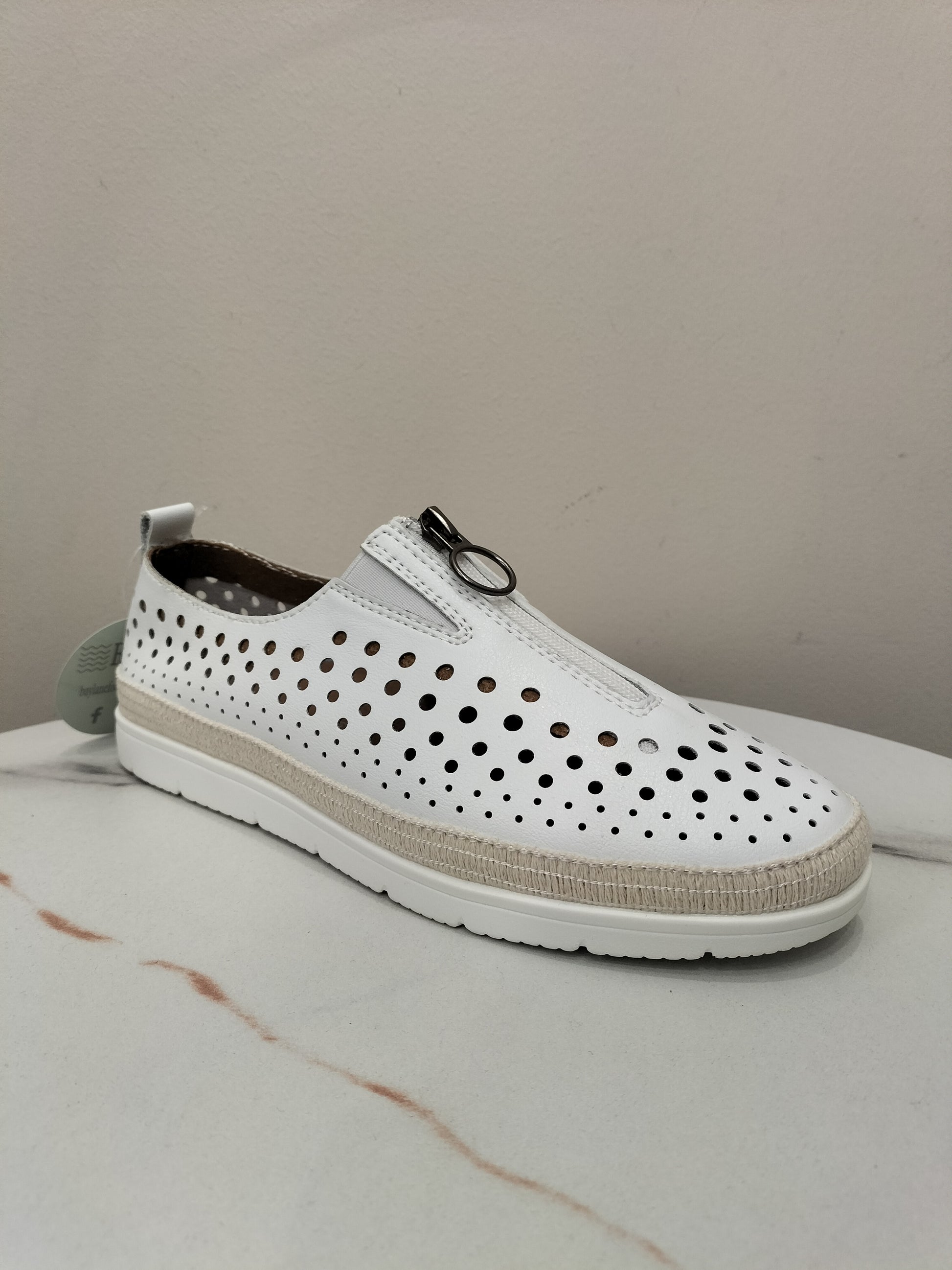The New Mercury by Bay Lane is a stylish leather sneaker made for comfort and ease. With delicate cutwork detailing and a woven espadrille-style trim, it’s lightweight, breathable, and perfect for warm-weather wear. The front zip makes it easy to slip on and off, while the cushioned footbed keeps you comfortable all day.
