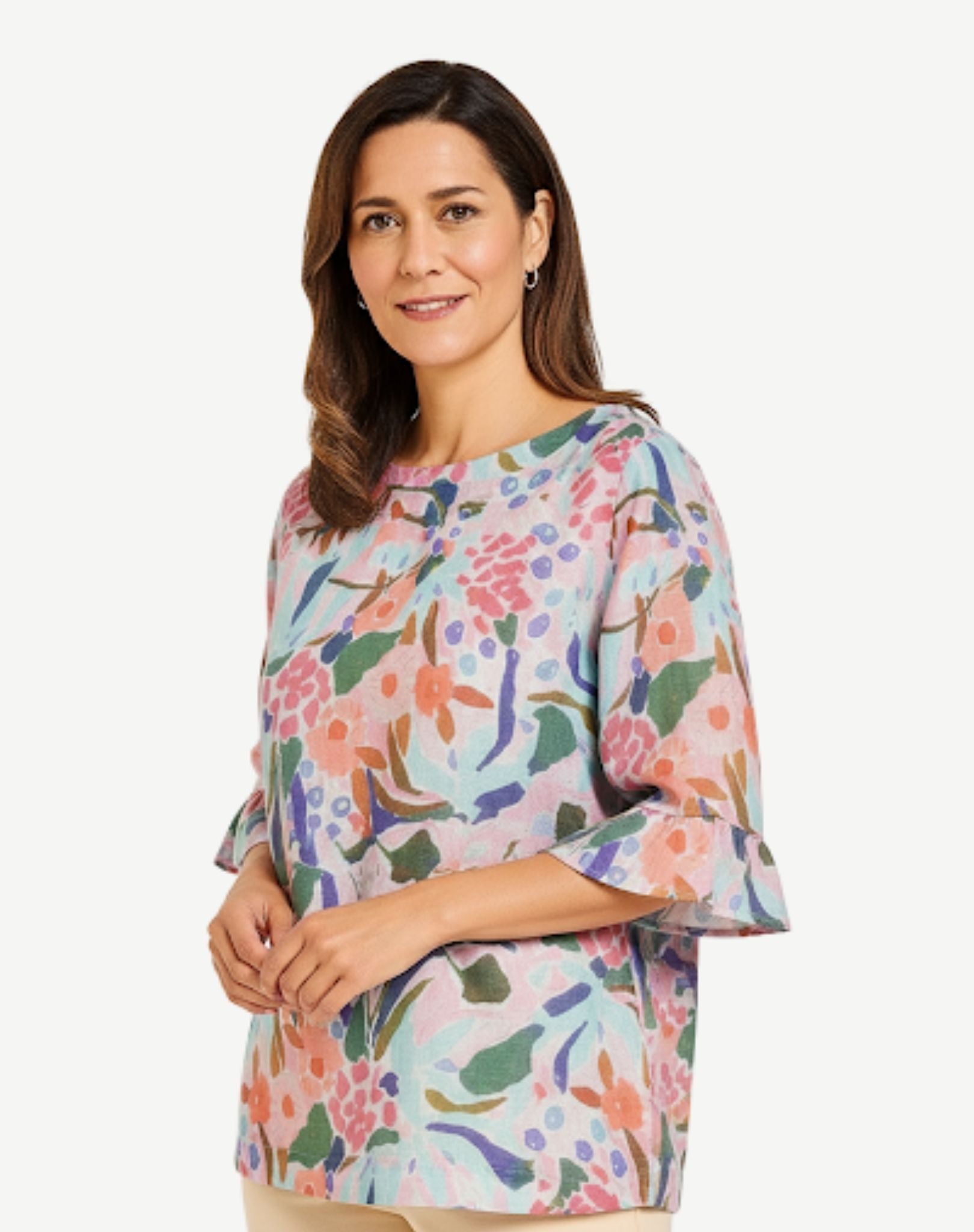 Bright and refreshing, the Corfu Paige top showcases a bold floral print. Crafted from a lightweight fabric, it drapes softly and ensures breathable comfort for all-day wear. The round neckline and relaxed fit create a flattering silhouette, while the 3/4 length sleeves finished with a soft frill detail add a feminine touch. Perfect for pairing with neutral pants or denim, this versatile piece easily transitions from casual outings to polished occasions.