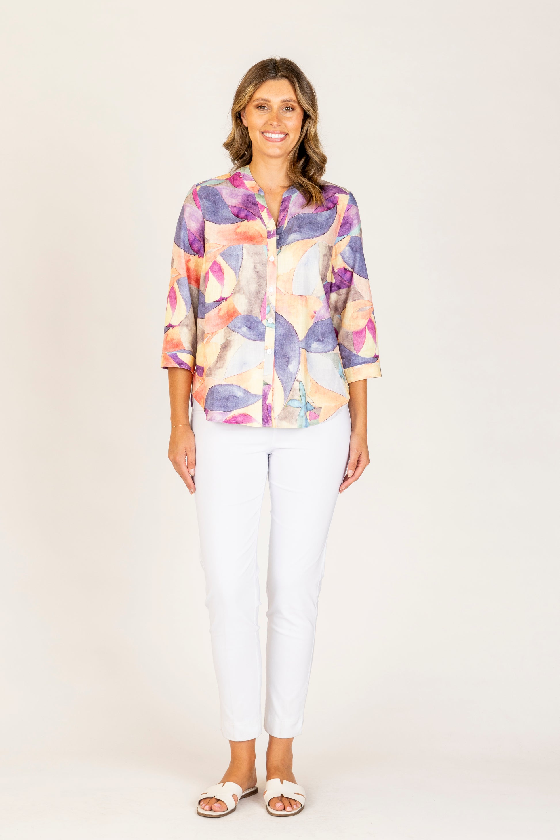 Featuring a bold painterly abstract print in shades of purple, peach, and soft neutrals, it brings a fresh and artistic edge to your wardrobe. The button-through front, classic collarless neckline, and relaxed 3/4 sleeves make it versatile and flattering, whether worn tucked into pants or layered over a tank.