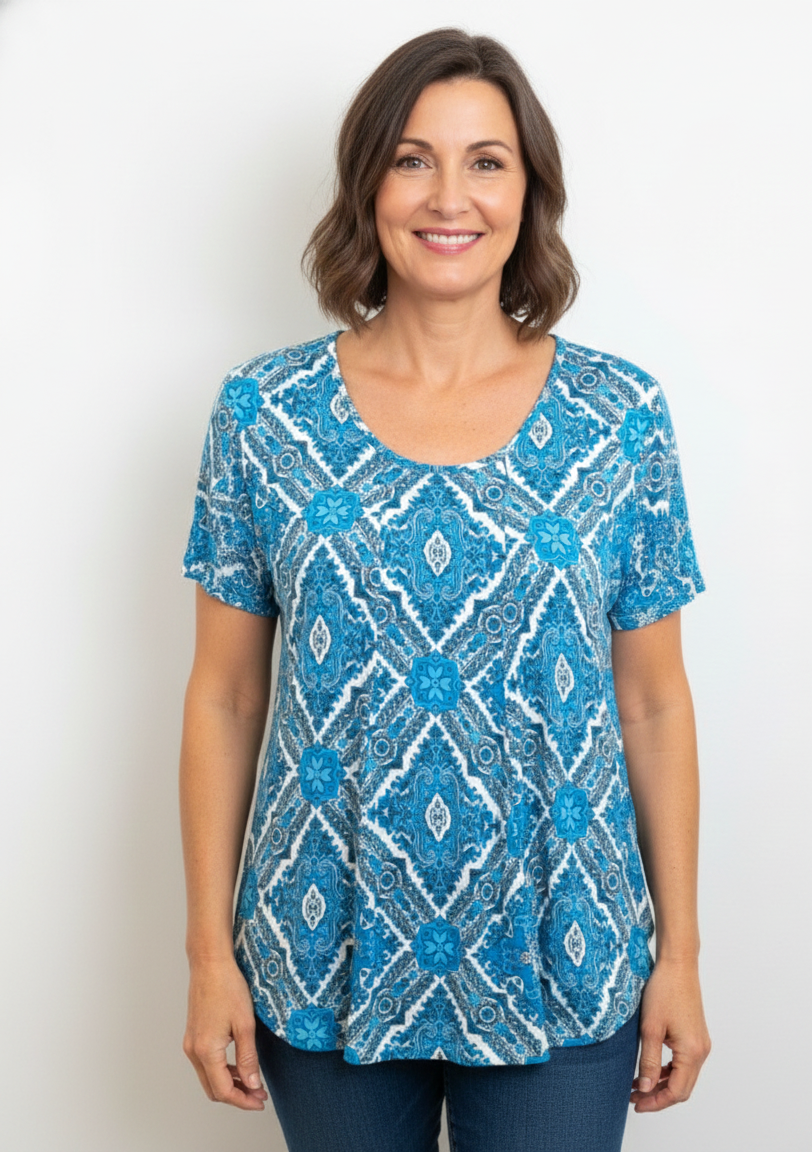 Get ready for summer with the Postage Tee! This top features a flattering scooped neckline and short sleeves, perfect for warmer weather. The panel lines add a touch of swing shape, making it both comfortable and stylish.