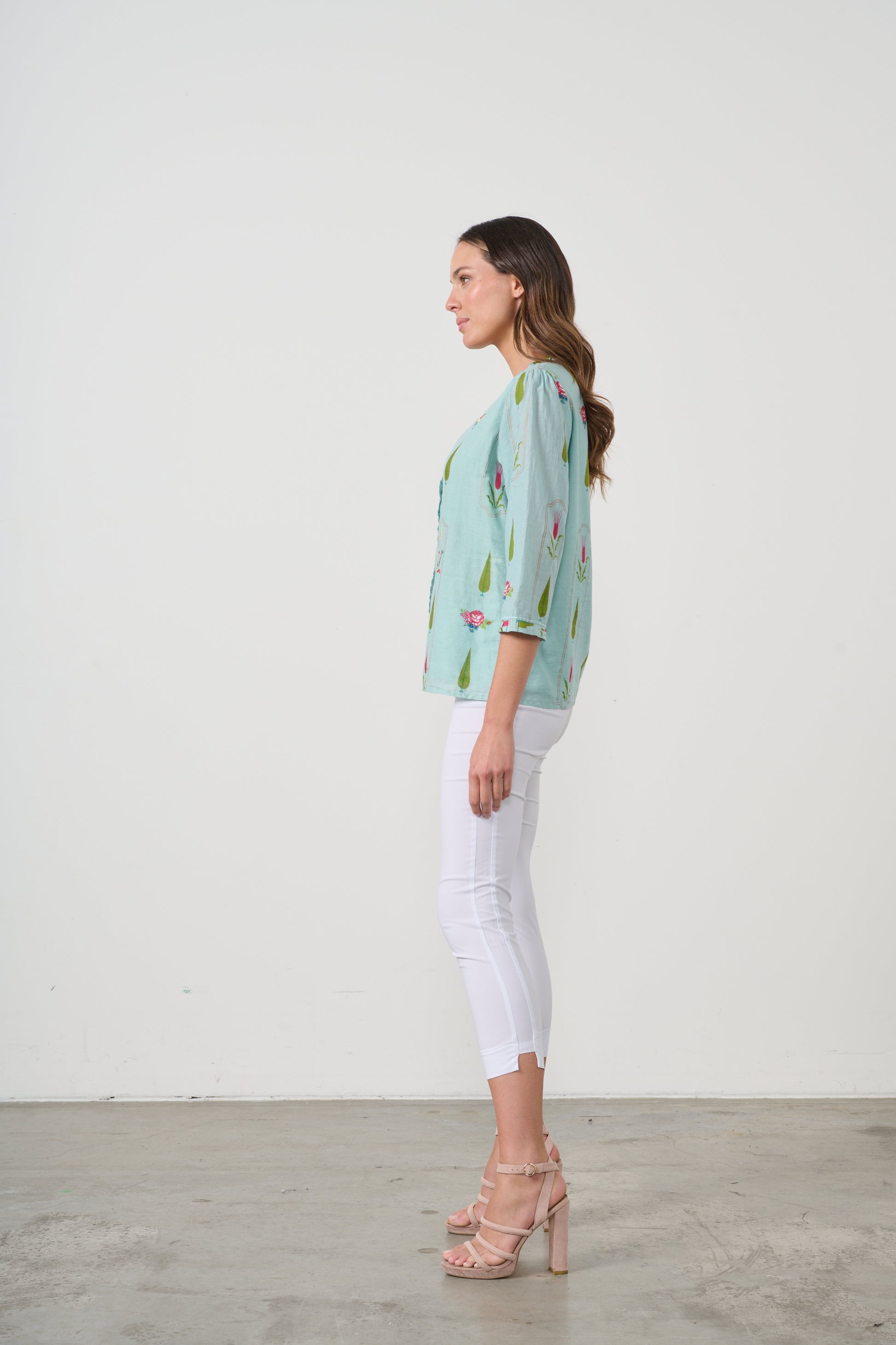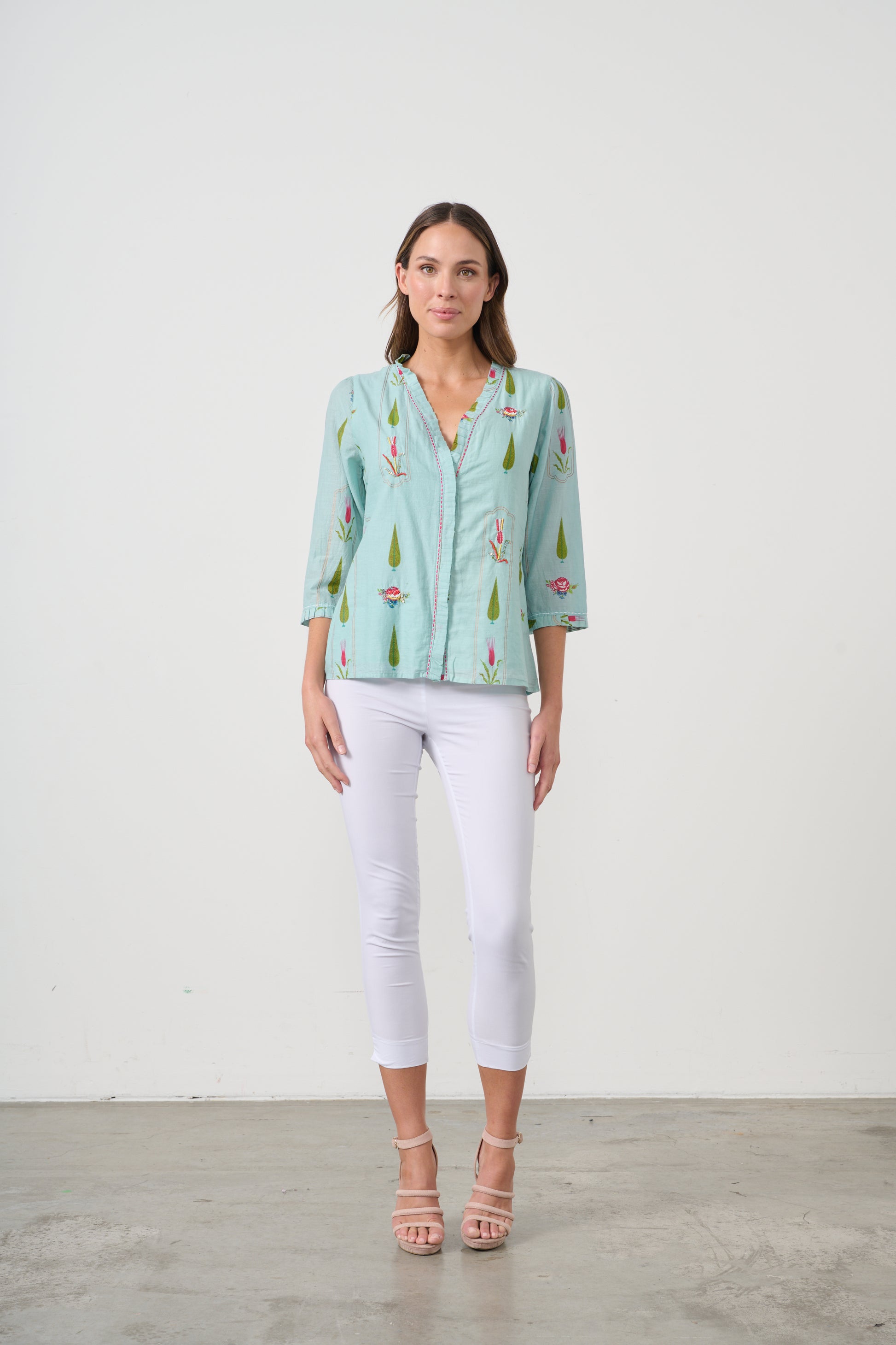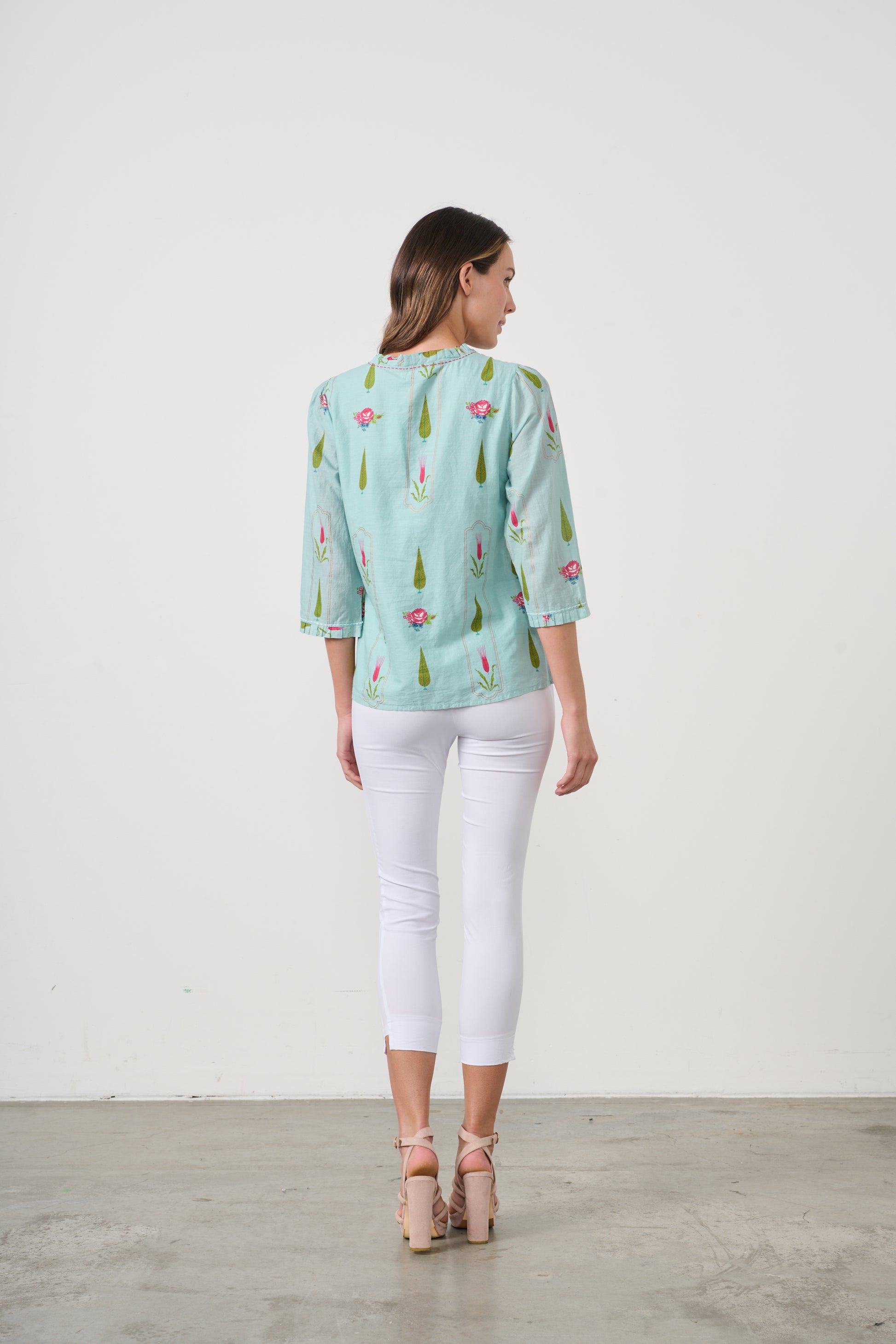 Fresh and feminine, this printed blouse is a versatile piece that brings effortless style to your everyday wardrobe. Designed in a soft aqua base with delicate floral-inspired motifs, it offers a light and airy feel perfect for spring and summer days.