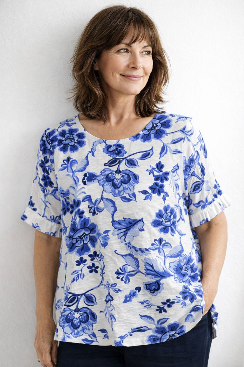 A cheerful, easy-wear tee featuring a vibrant cobalt-blue floral print on a soft, light base. With a relaxed fit, round neckline, and short cuffed sleeves, it’s an effortless everyday piece that adds a fresh pop of colour to your wardrobe.