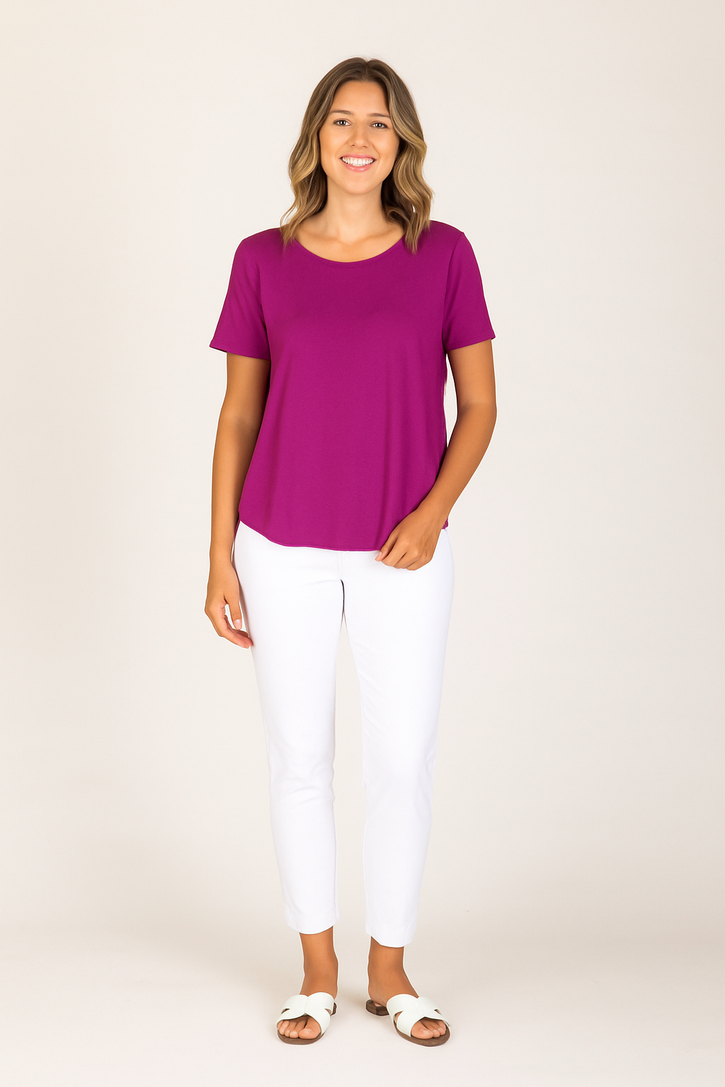 The short sleeves and classic round neckline create a timeless look, while the gentle drape of the fabric ensures a relaxed yet elegant fit. Lightweight and versatile, it’s ideal for layering or wearing on its own, whether paired with crisp white pants for a fresh look or dressed down with your favourite casual bottoms.