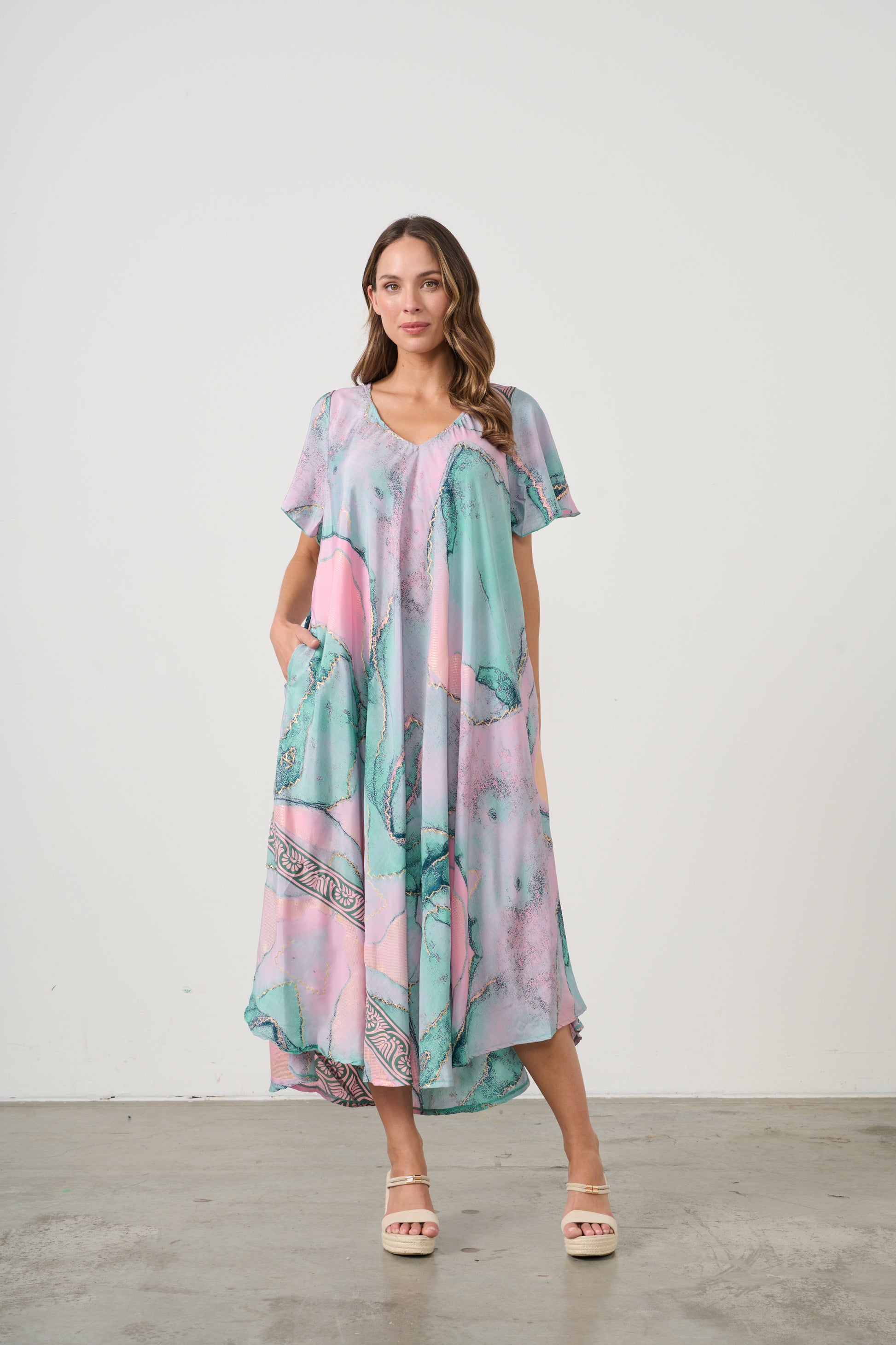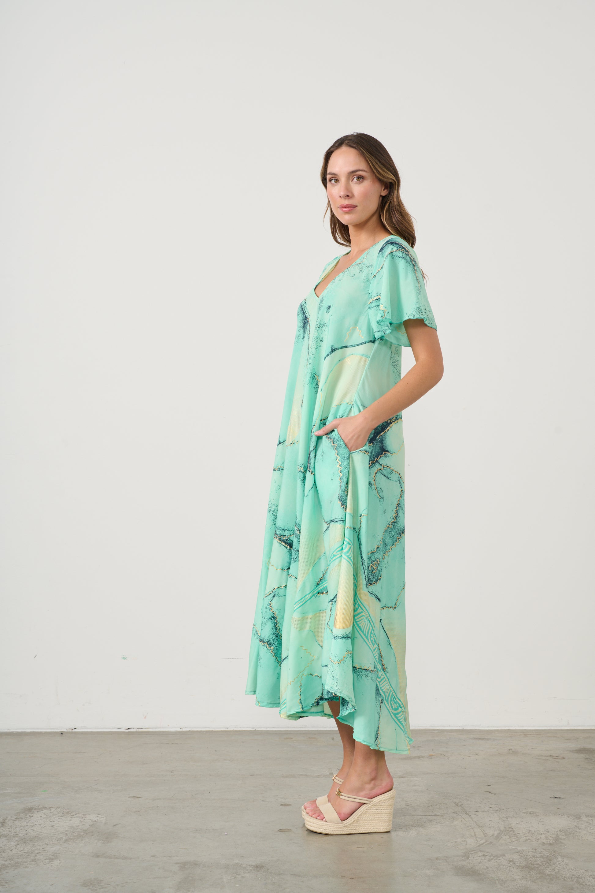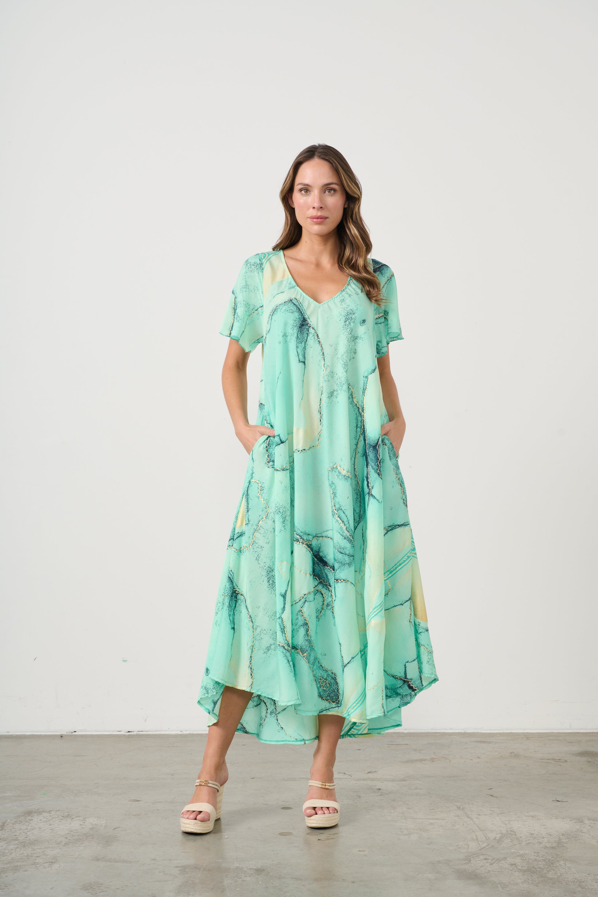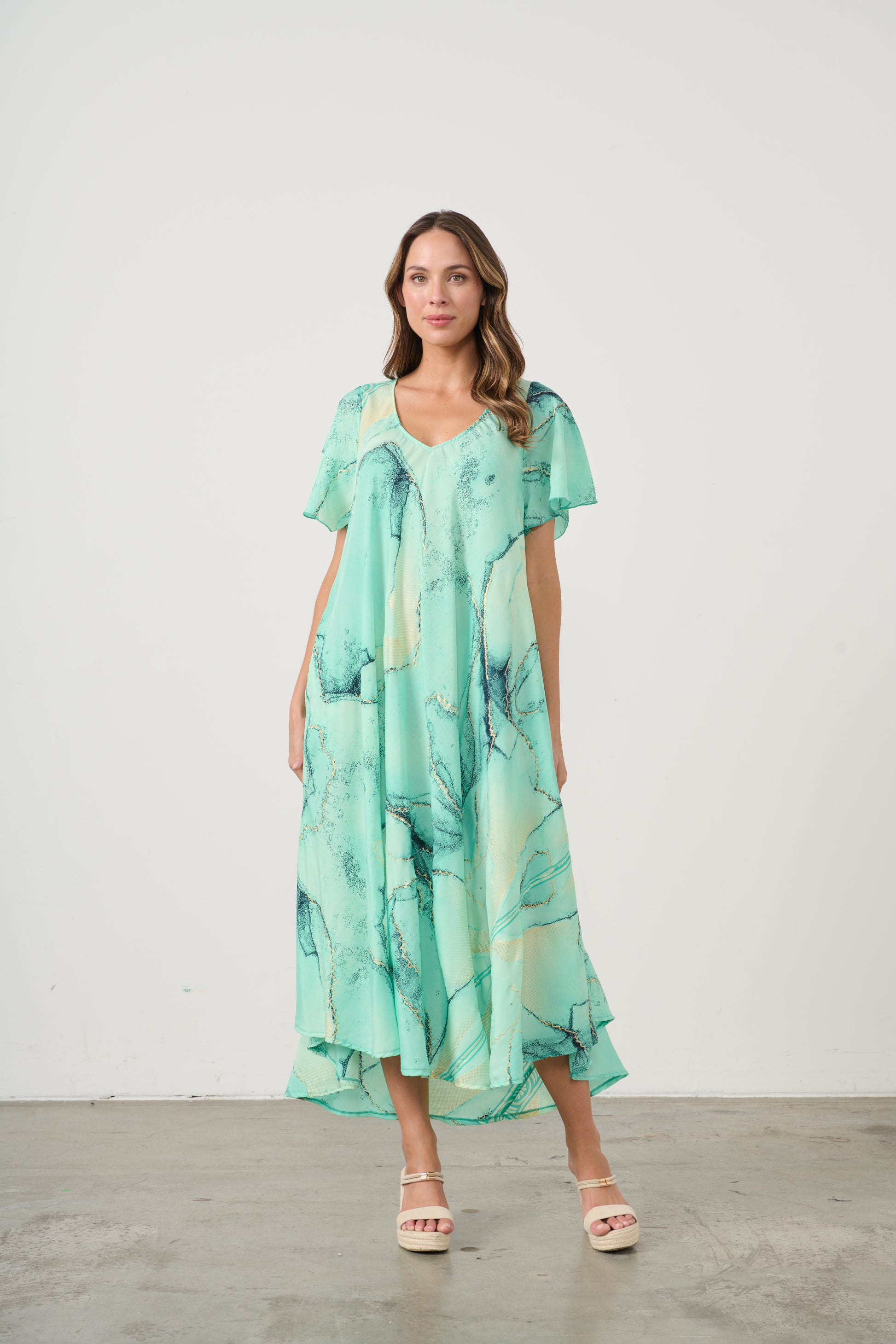 Step into effortless elegance with this flowing V-neck dress, designed in a fresh aqua green print with soft marbled accents. The relaxed silhouette drapes beautifully, creating graceful movement with every step, while the lightweight fabric ensures comfort and breathability.