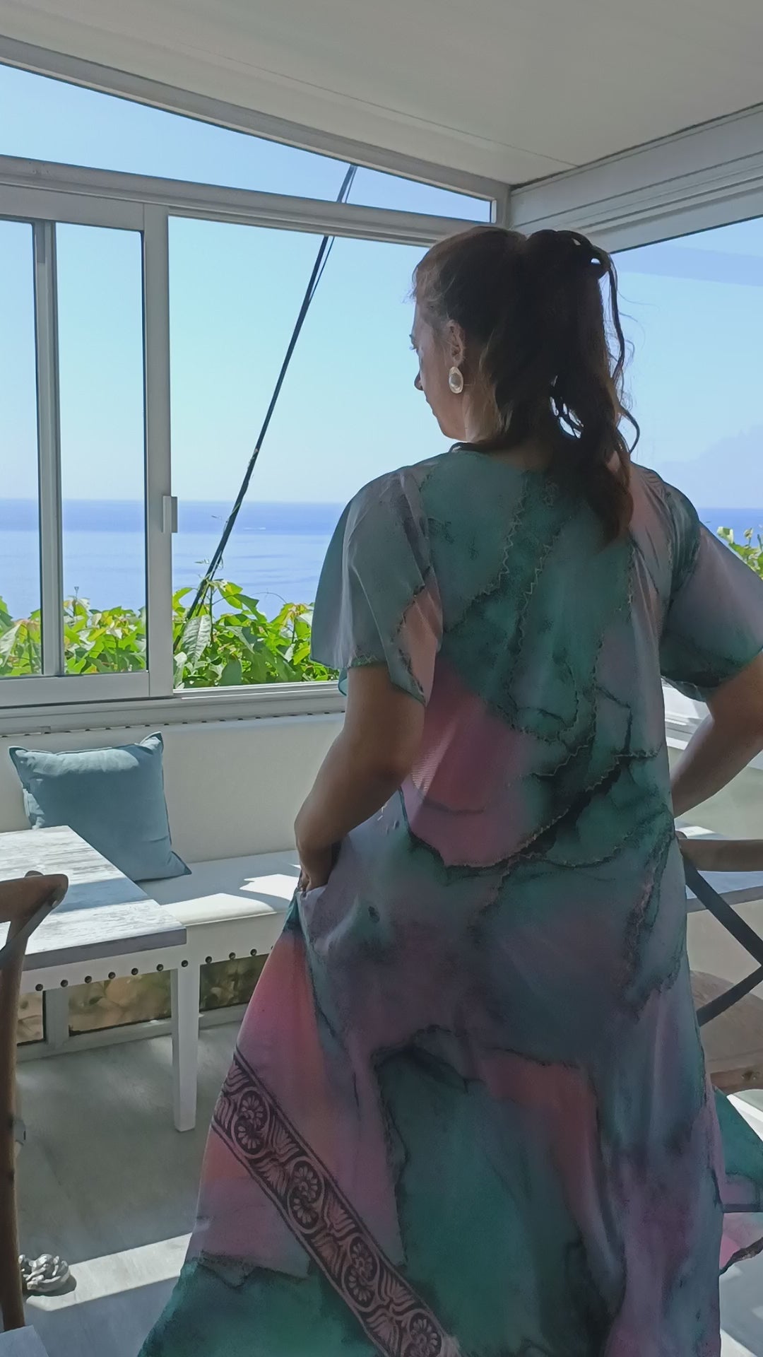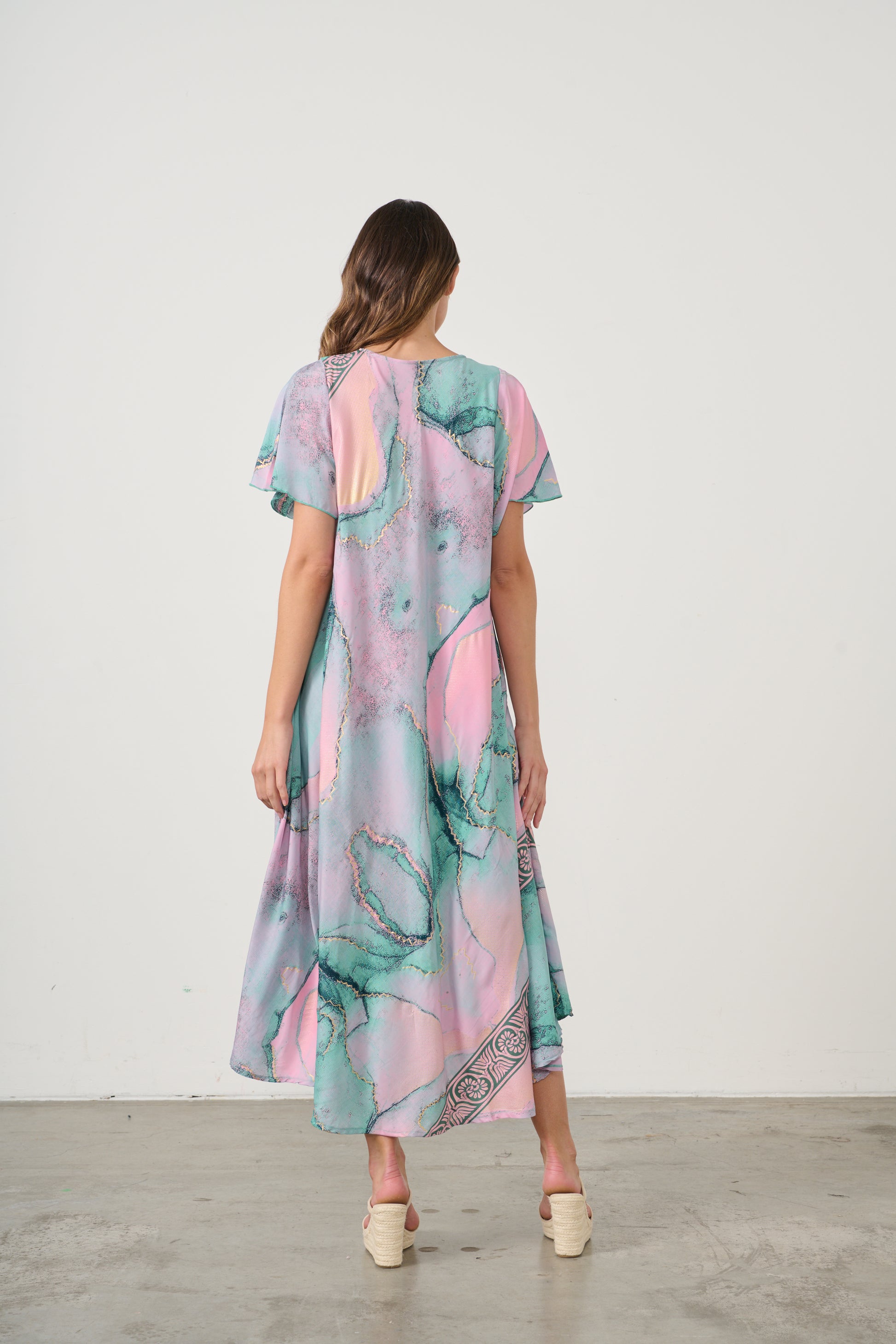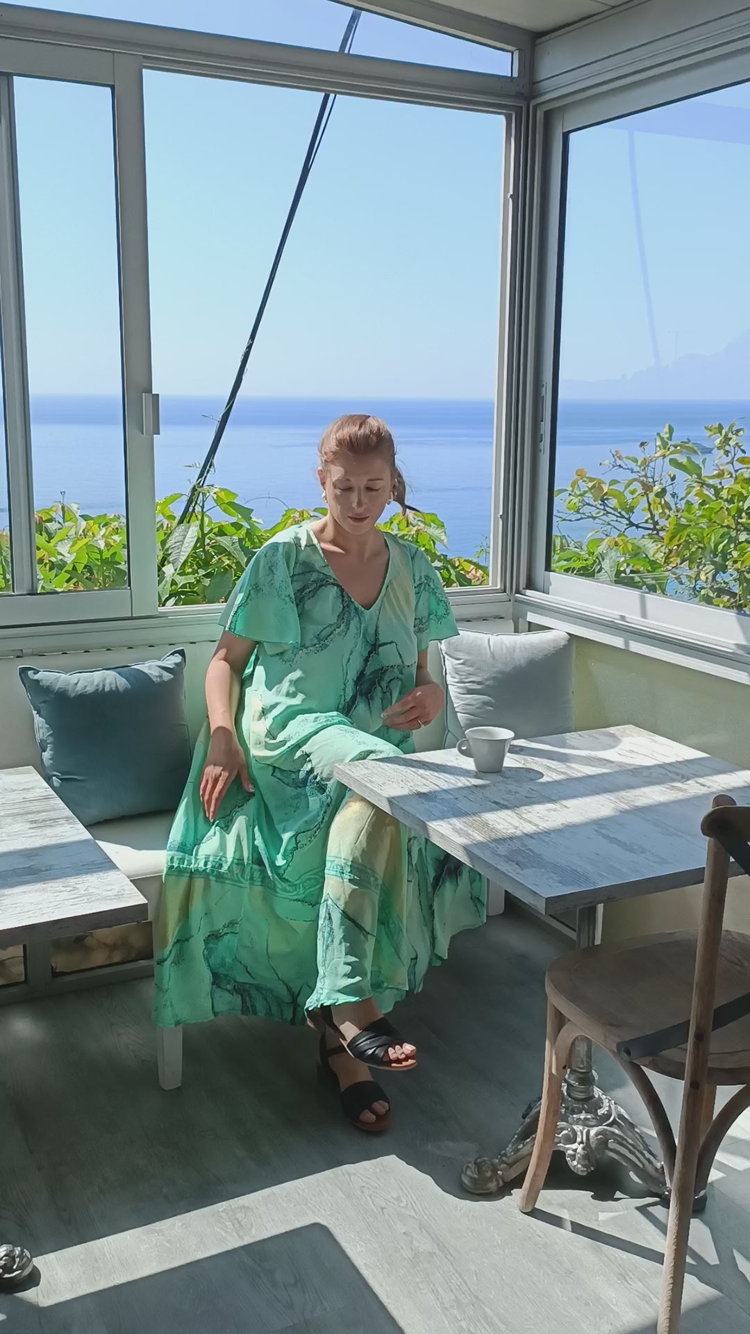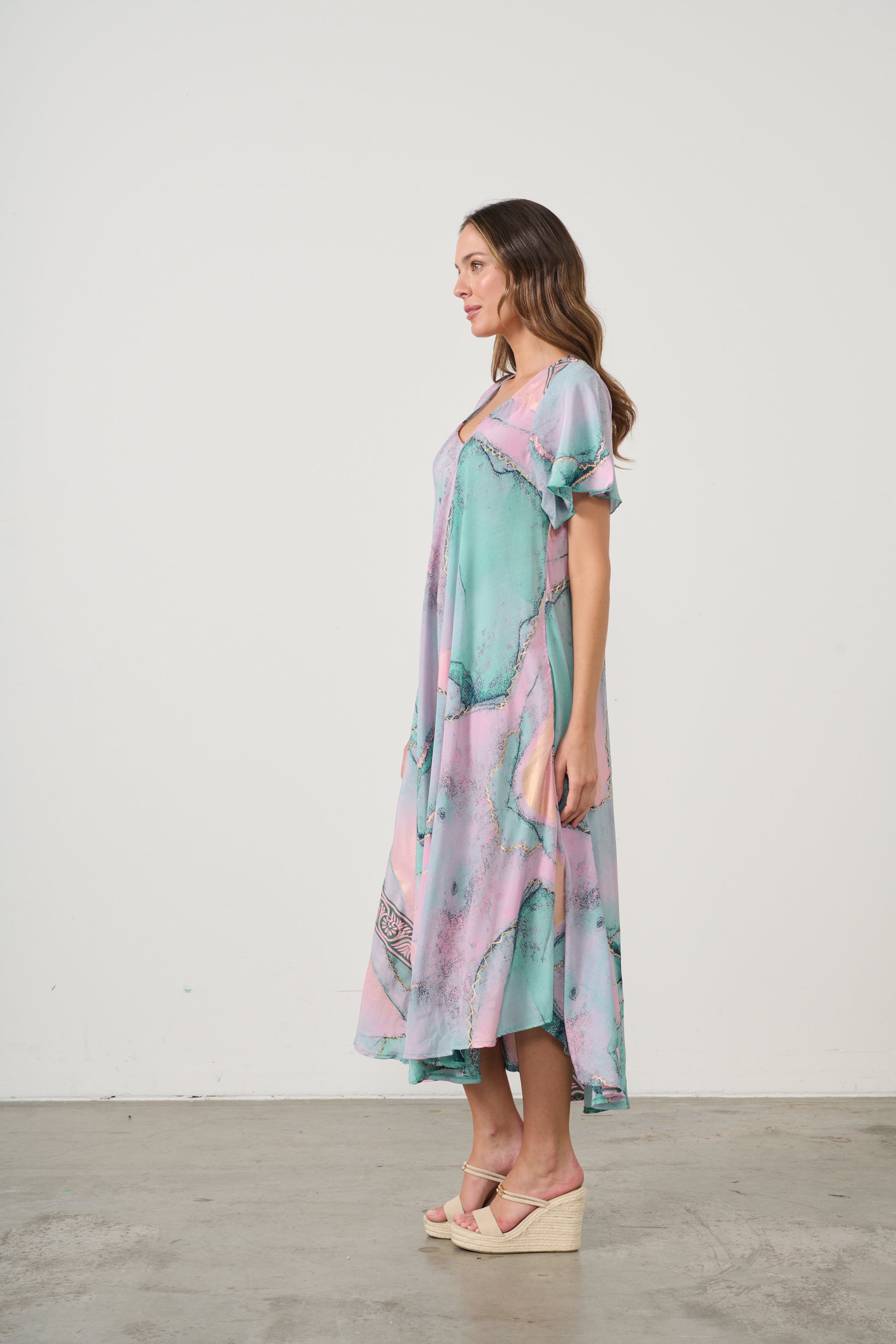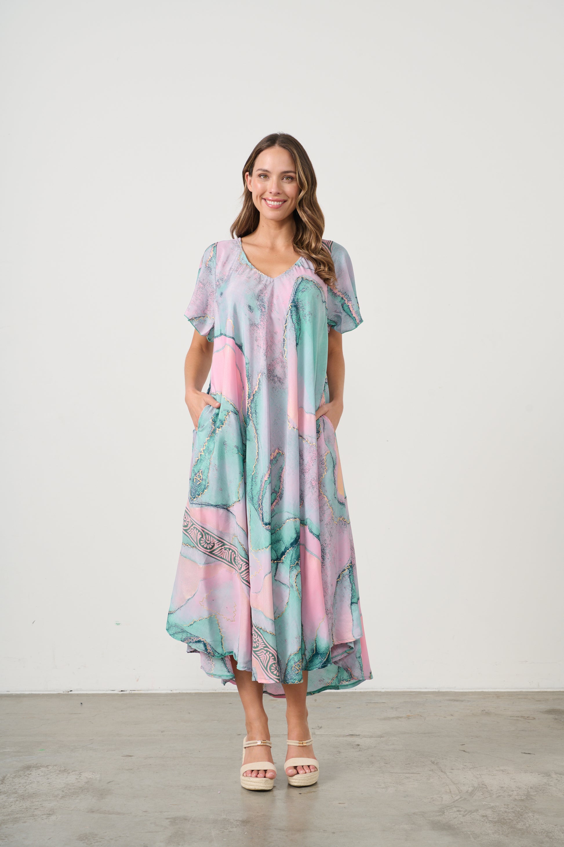 Step into effortless elegance with this flowing V-neck dress, designed in a fresh aqua green print with soft marbled accents. The relaxed silhouette drapes beautifully, creating graceful movement with every step, while the lightweight fabric ensures comfort and breathability.