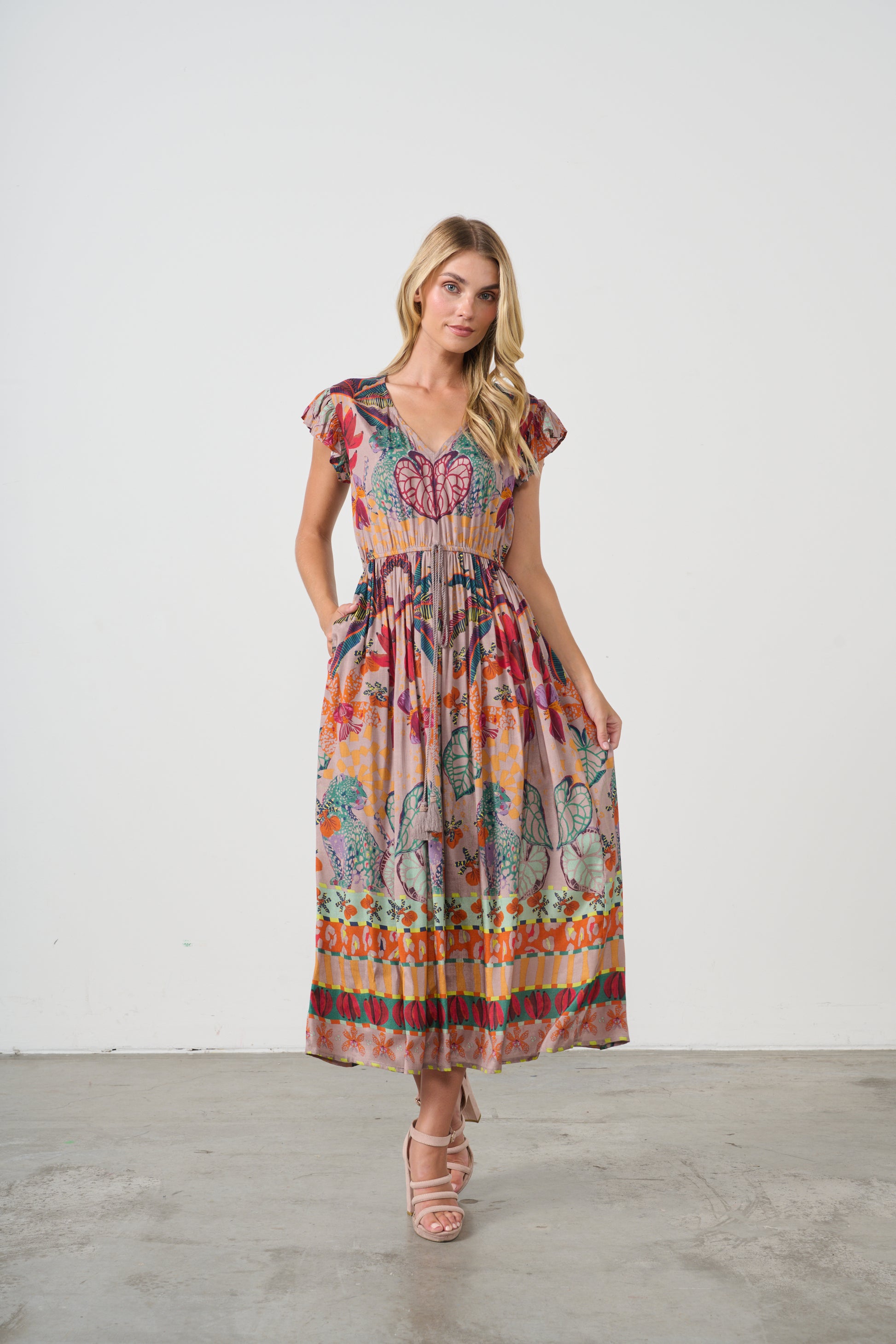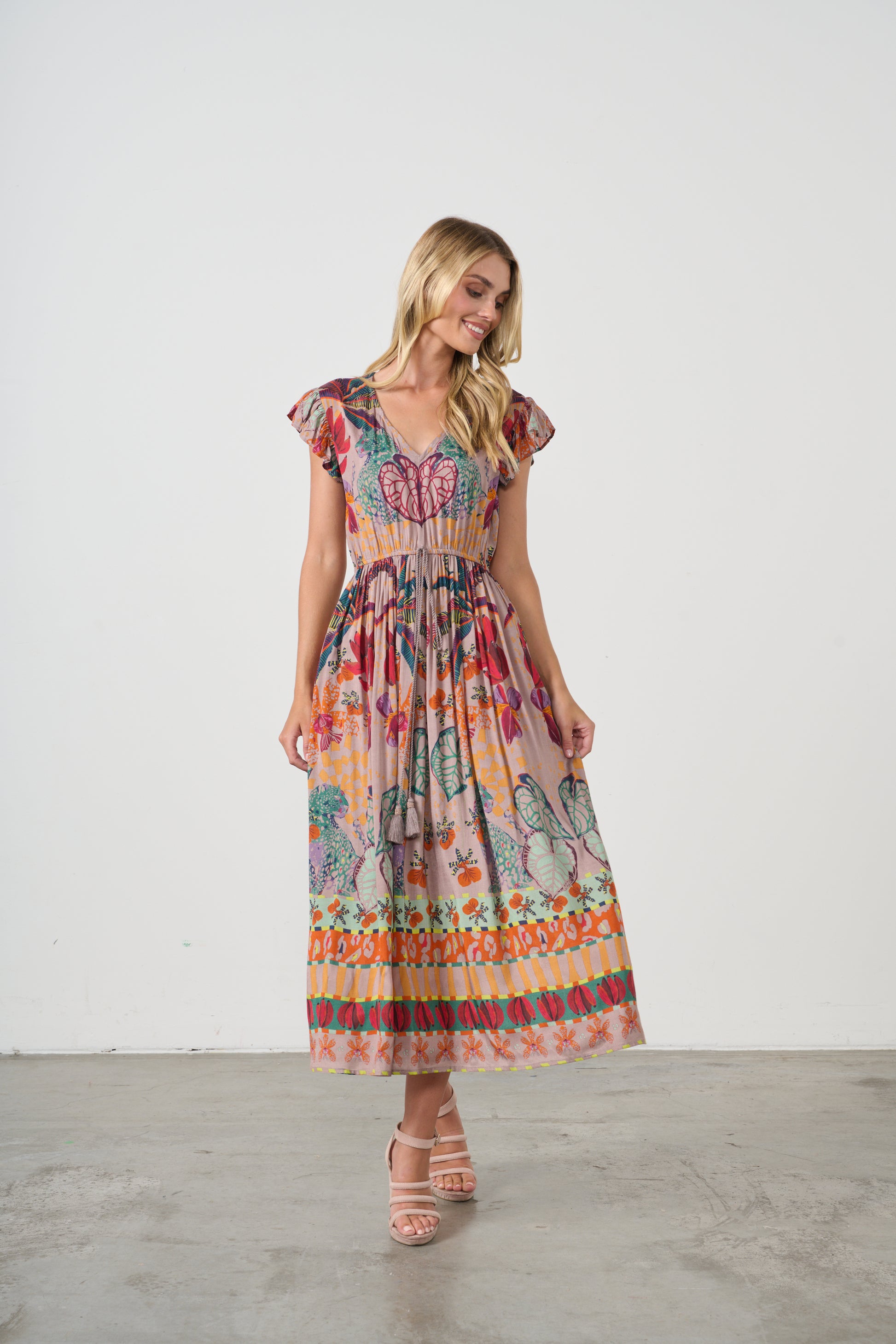 Vibrant and free-spirited, this boho-esque style brings colour and charm to your wardrobe. Crafted from soft, breathable fabric, it features a flattering V-neckline, cap sleeves, and an elasticated waist for comfort and shape. The tiered skirt flows beautifully, creating a relaxed yet feminine silhouette perfect for warm days or casual evenings out.
