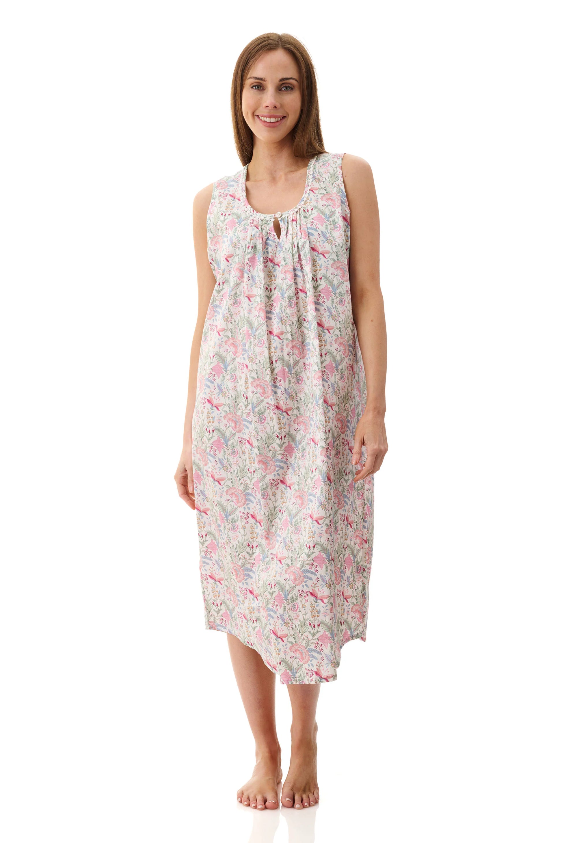 A sleeveless nightie in printed, non-stretch cotton. This unyoked nightie has a high back and a scoop neck front with contrasting trim. Central gathering creates fullness to the front. A matching dressing gown is available.