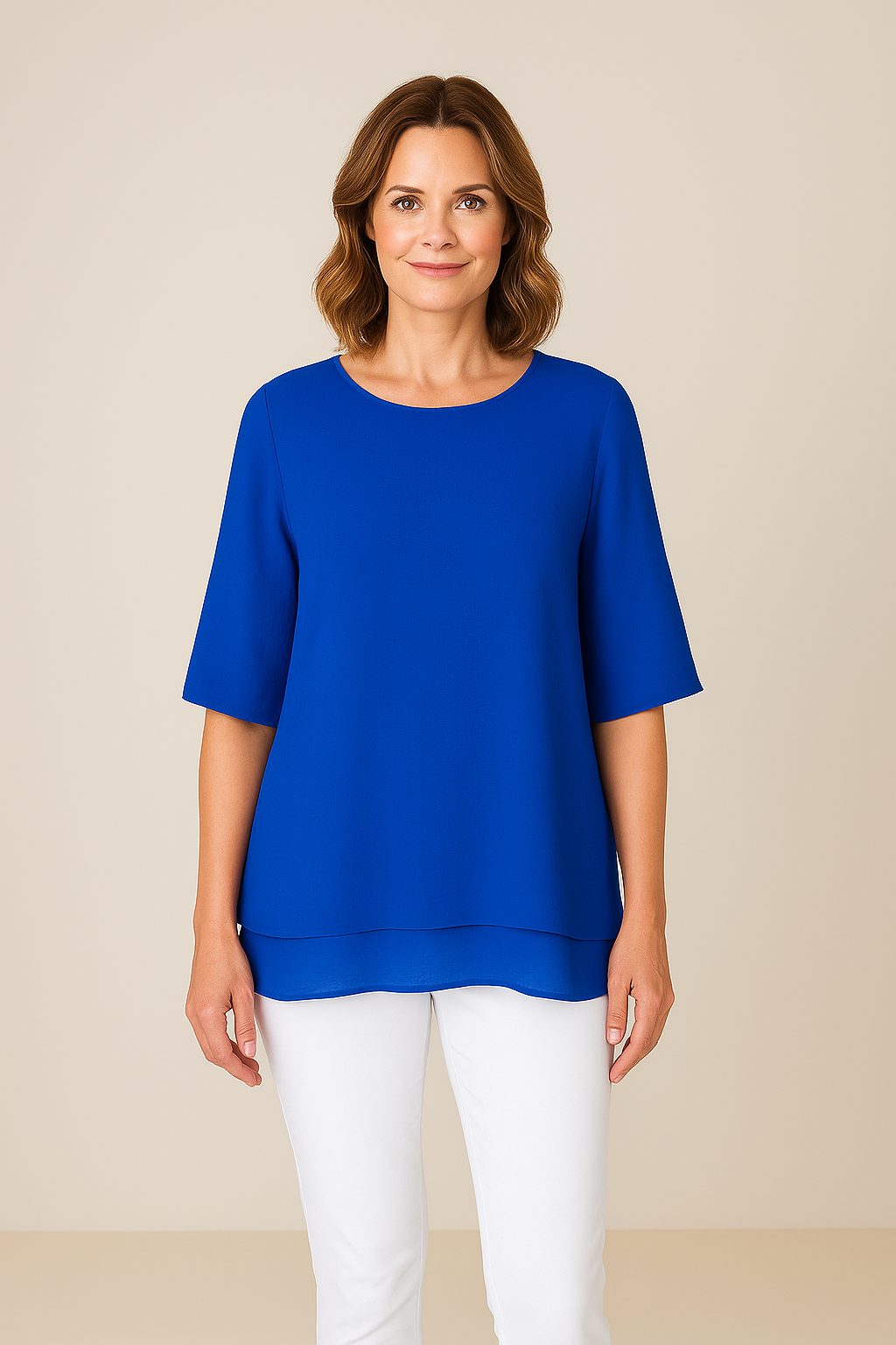Effortless and refined, this Corfu crepe blouse is a timeless addition to any wardrobe. Crafted from lightweight crepe fabric, it offers a soft drape and breathable comfort that’s perfect for all-day wear. The simple round neckline and straight silhouette are complemented by mid-length sleeves, giving it a clean, modern finish. Versatile and easy to style, this blouse pairs beautifully with tailored pants, skirts, or casual denim for a polished look every time.