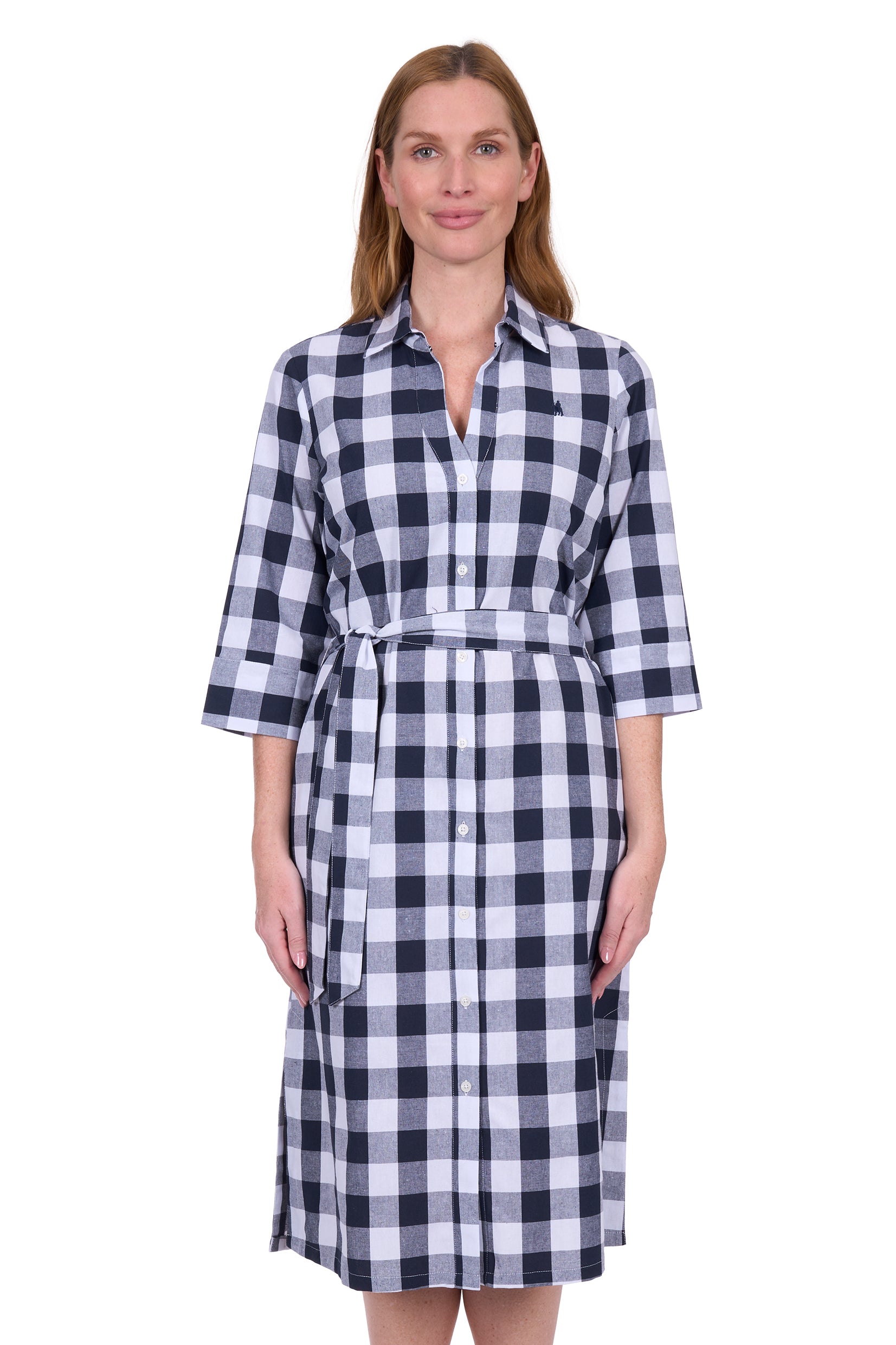 Cotton yarn dyed check, contrast piping on, inside neck, grosgrain taping on inside neck, and sleeve cuffs, waist tie, side pockets, side, splits, horseman embroidery on chest